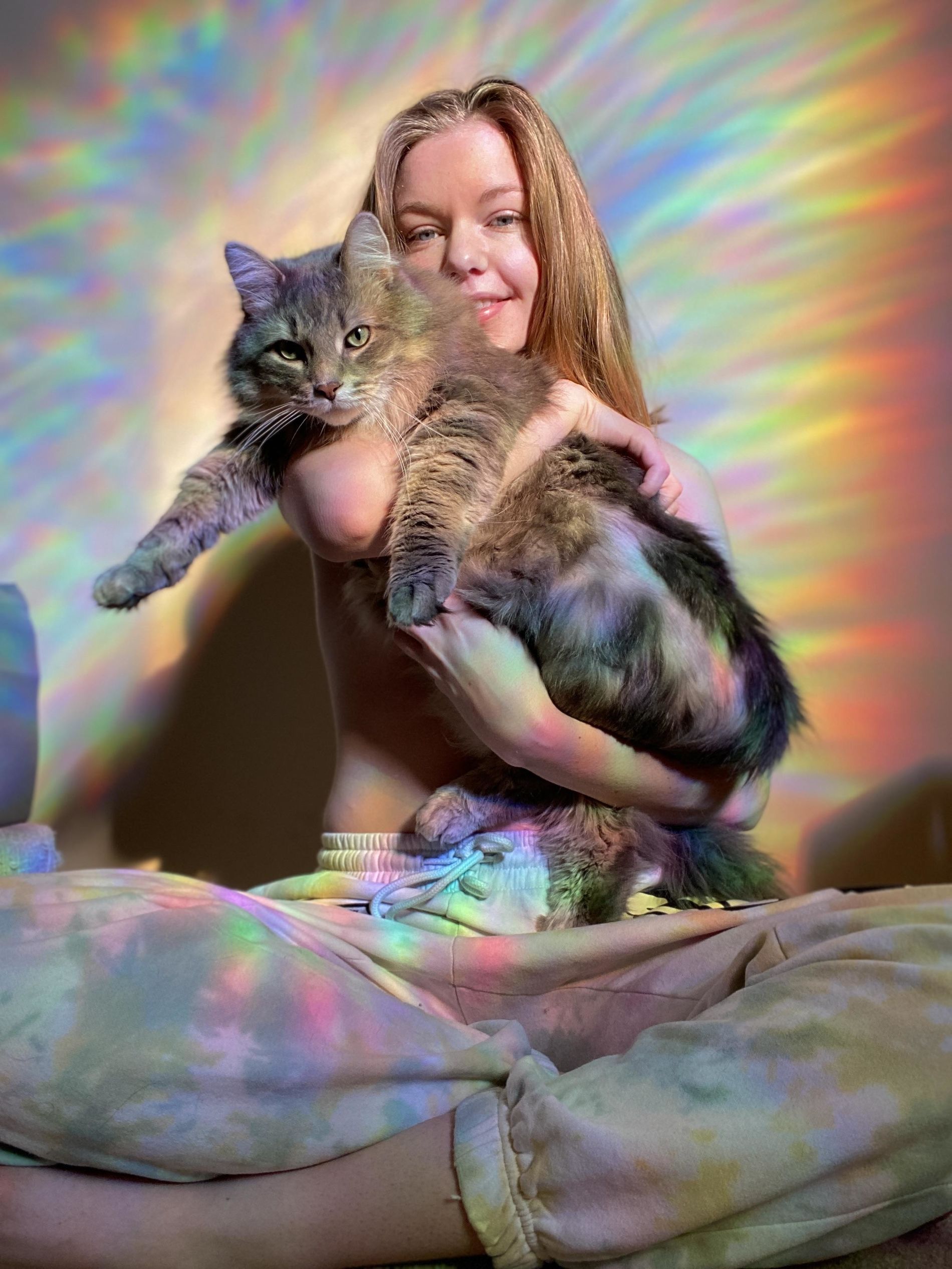 Красивый кот но девушка милей и краше сияние идет от ее тела ,фигурально.