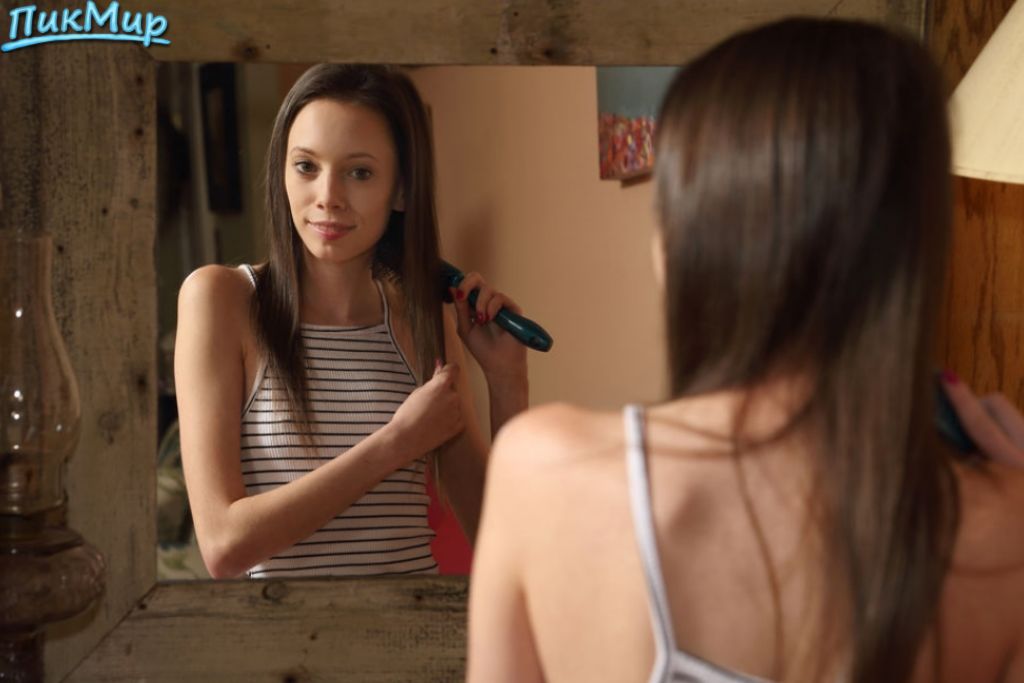 Худенькая девочка с шикарными волосами раздевается и играет со своей пиздой