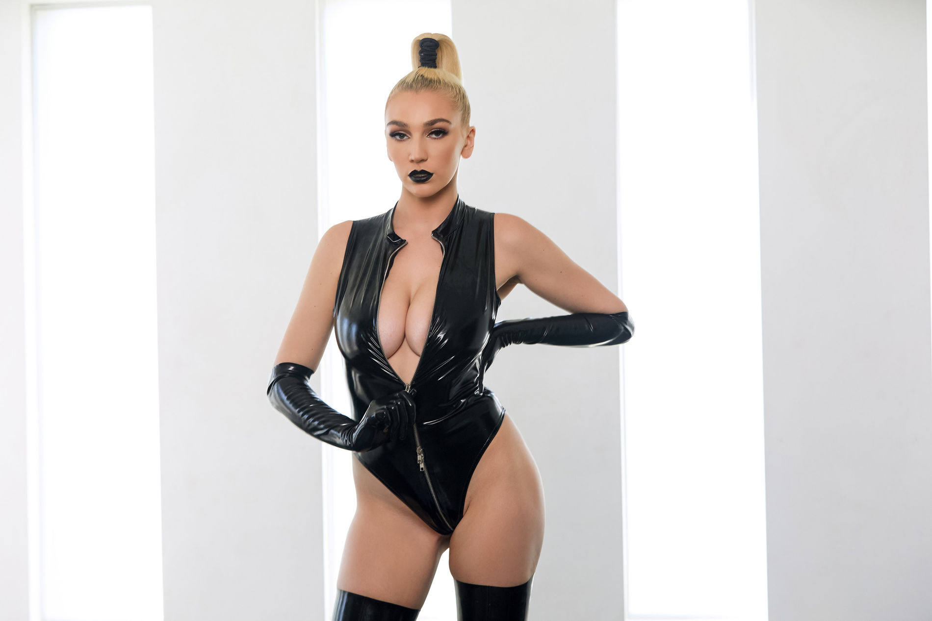 сексуальная блондинка позирует в чёрном латексе