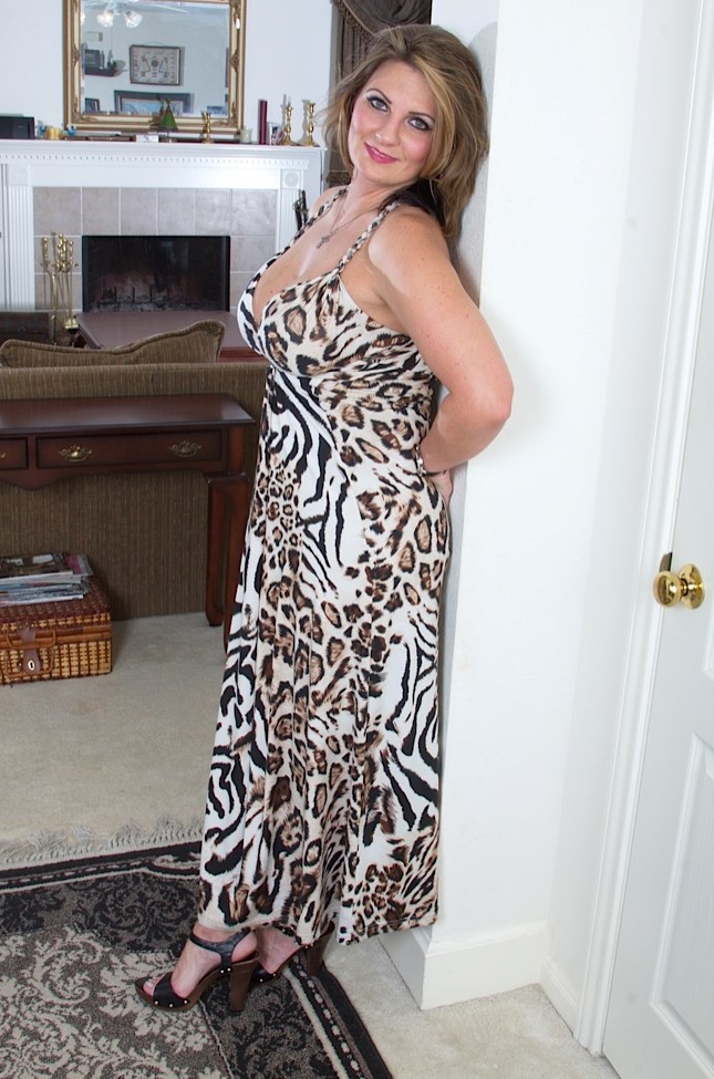 Домохозяйка Елена в прихожей снимает платье чтобы показать свою натуральную большую грудь и сочную киску