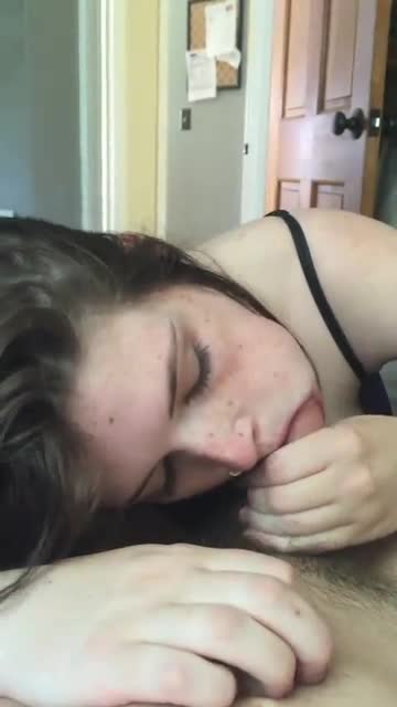 Девушка с красивой мордашкой с удовольствием посасывает член