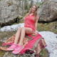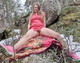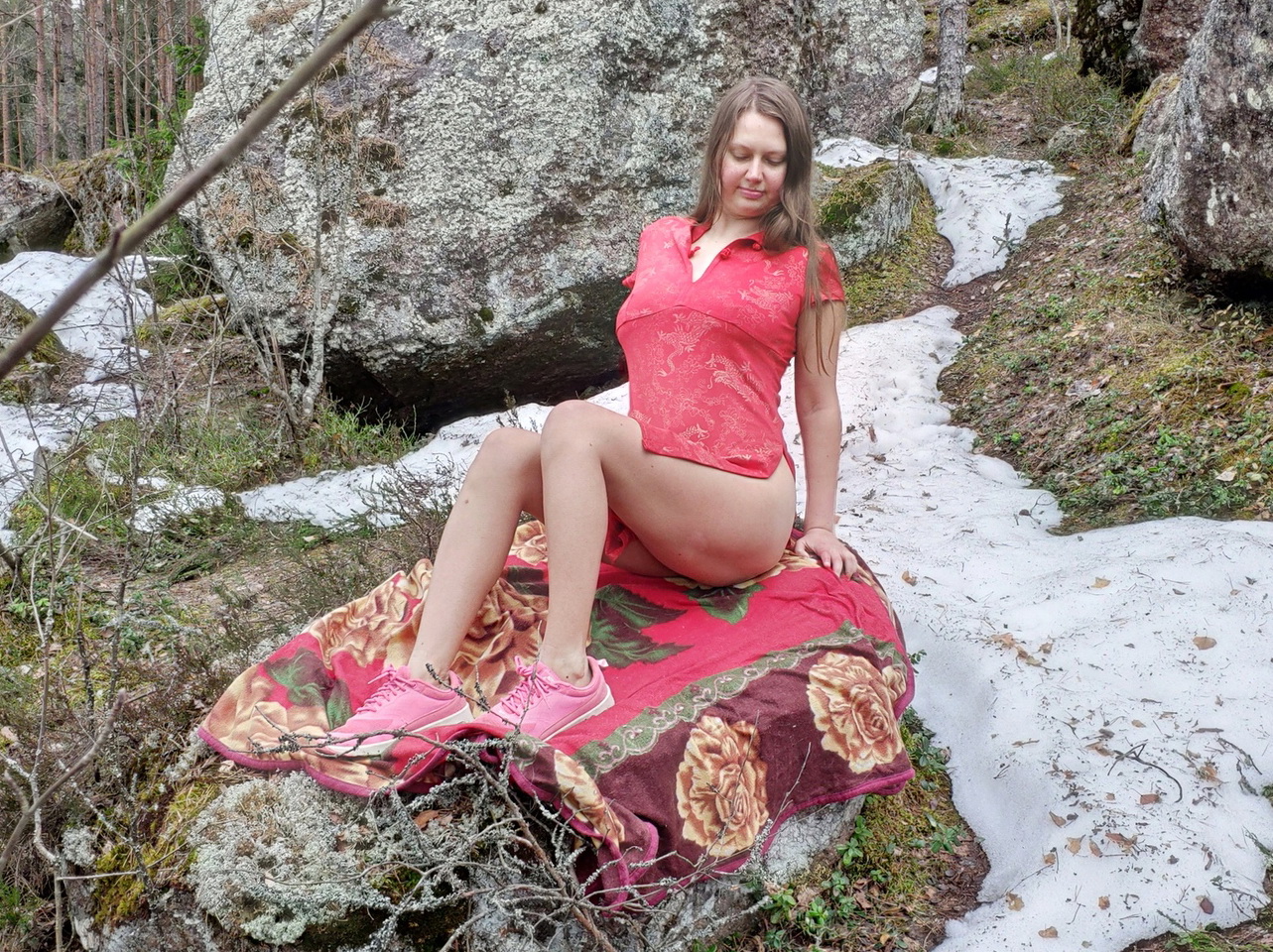 Девушка расстелила покрывало, чтобы показать себя на камне, вокруг которого ещё лежит снег.