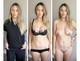 привлекательная женщина позируя в разной одежде демонстрирует свою грудь