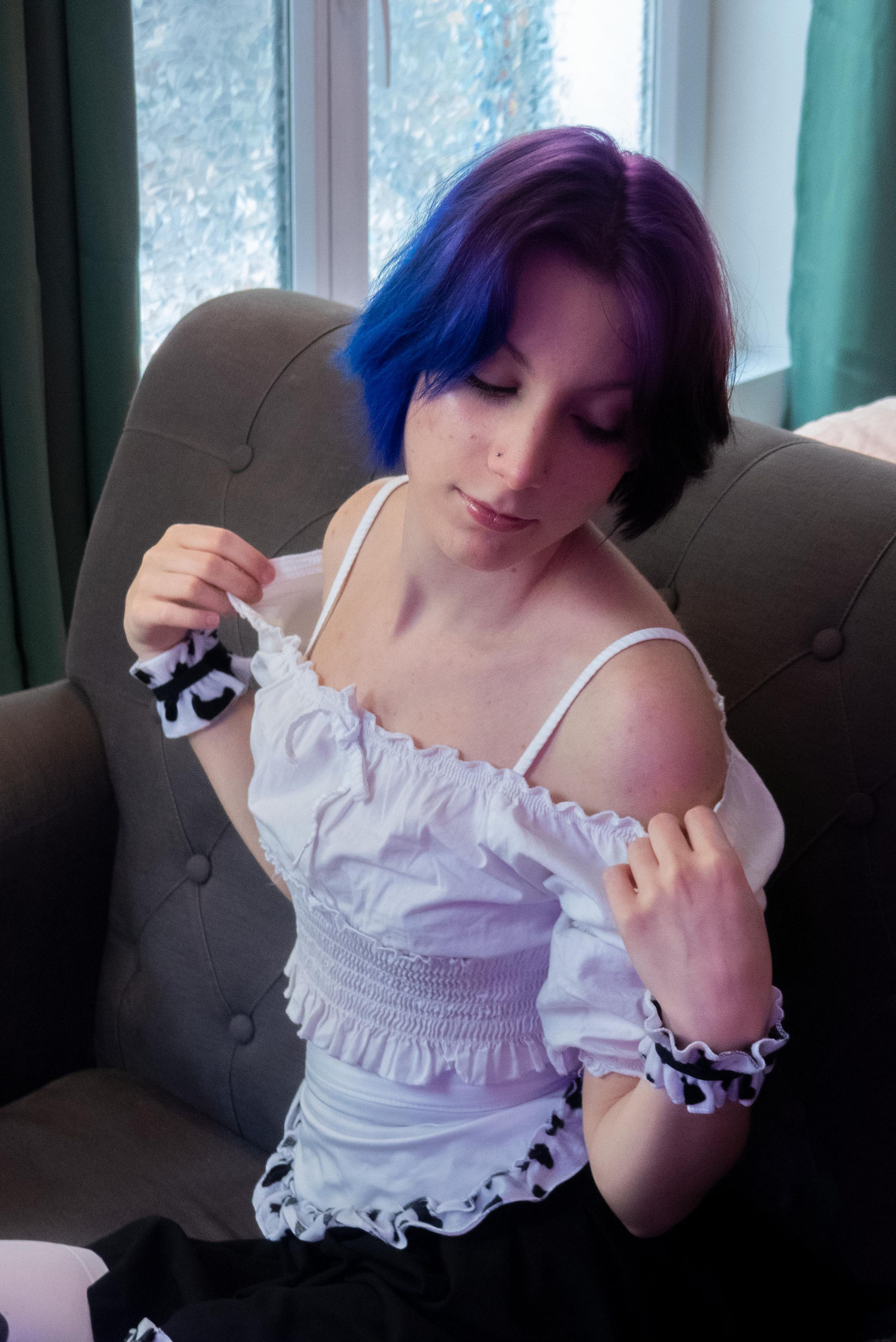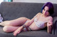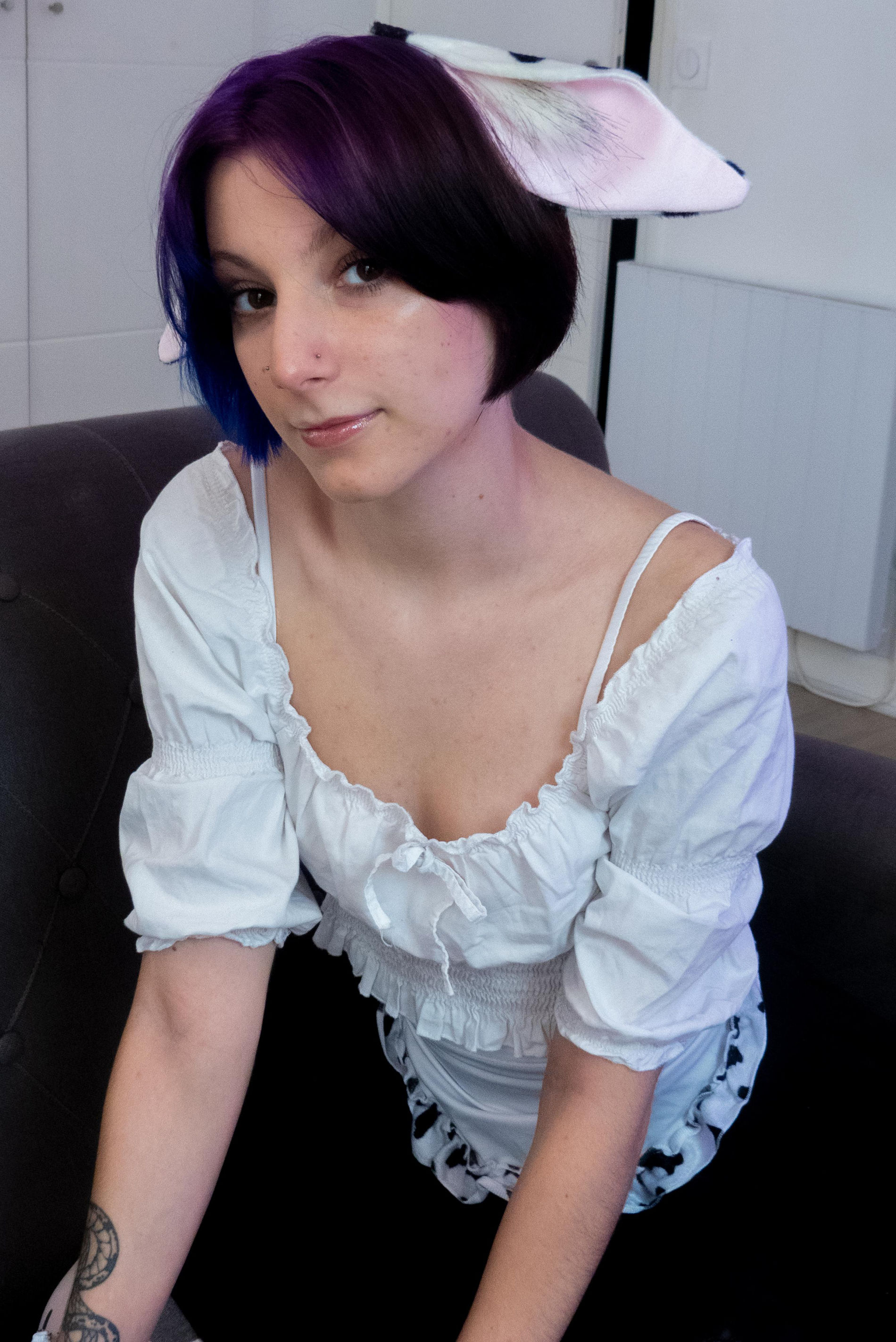 Молодая стеснительная девушка из Франции, с интересным цветом волос, постепенно раздевается на диване и показывает свои тату, стройное тело, пирсинг на сосках.