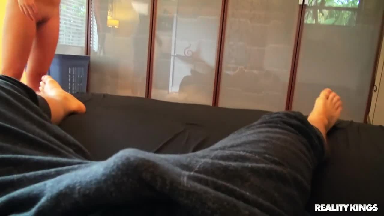 Тёлочка с очень маленькой грудью скачет на члене своего парня и принимает сперму в ротик.