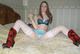 у неё и наряд яркий- юбка ничего не прикрывает и колготки с рисунком .
