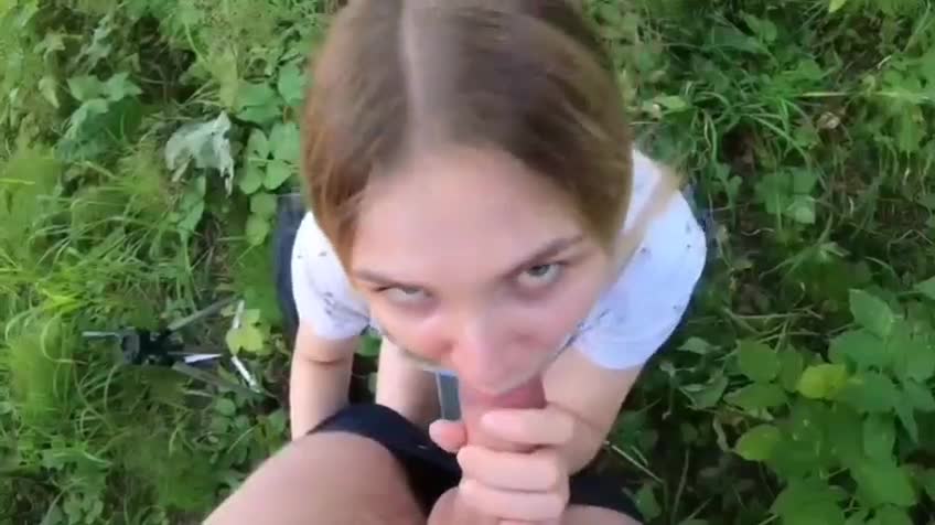 Страстный отсос и секс парочки у дерева с окончанием в рот