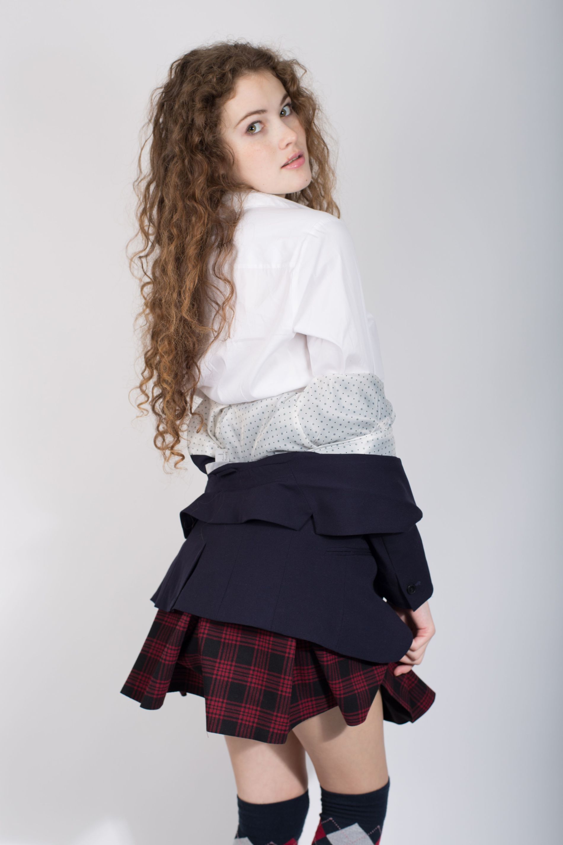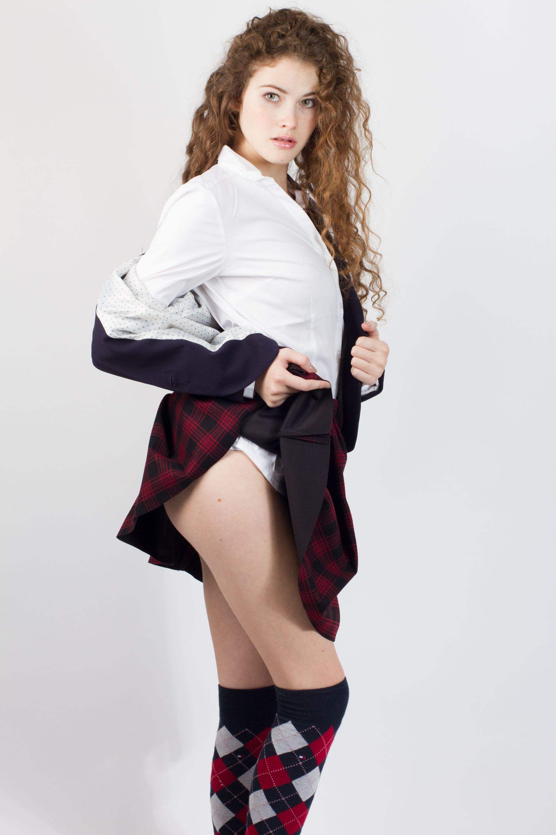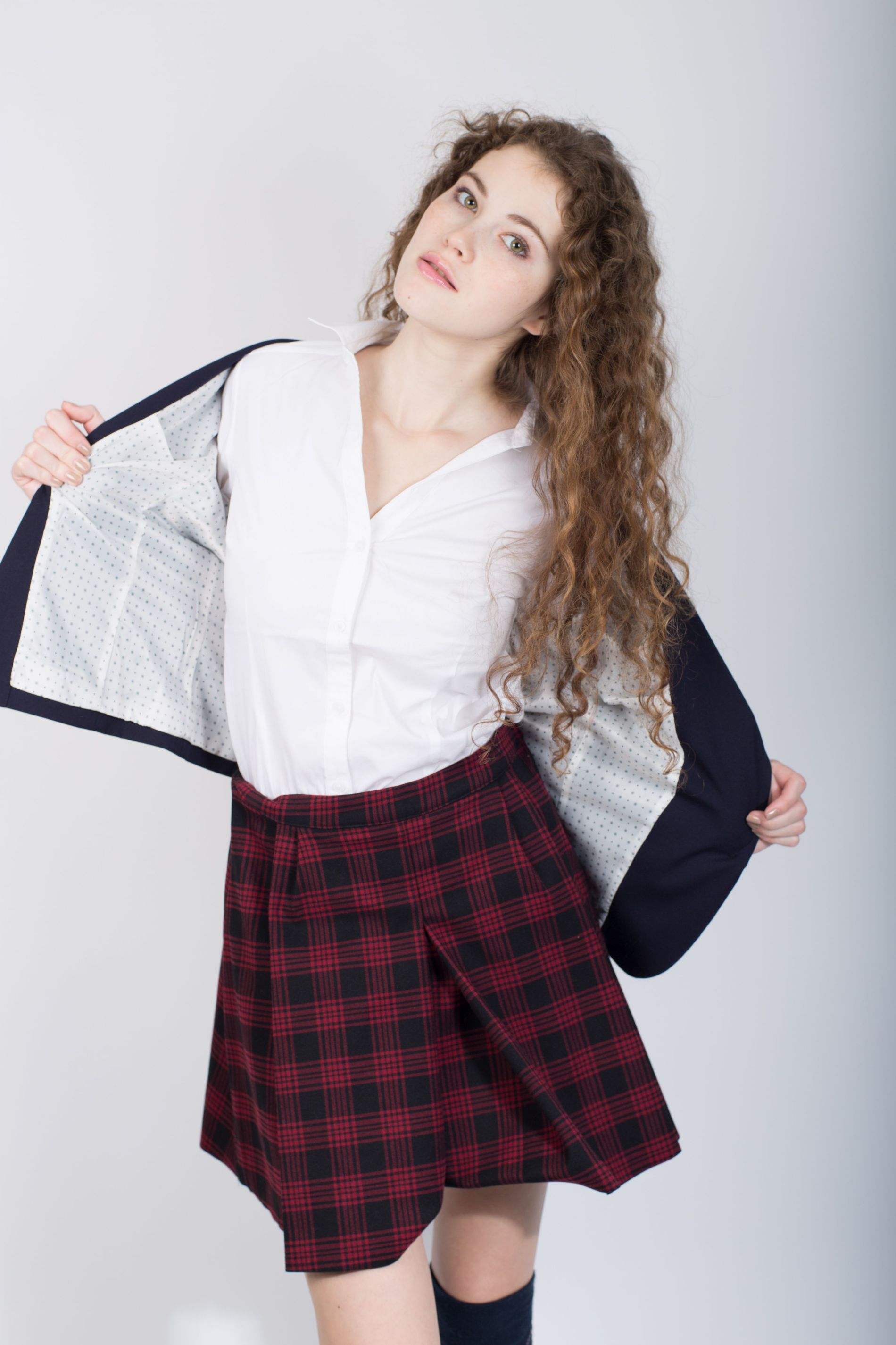 девушка с кудрявыми волосами и юбкой в клеточку позирует без трусиков