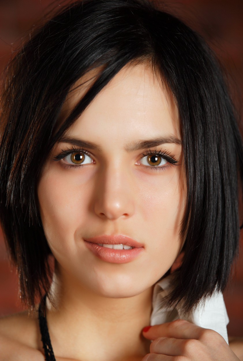Темноволосая красотка с маленькой грудью обнажает стройную фигуру в соло