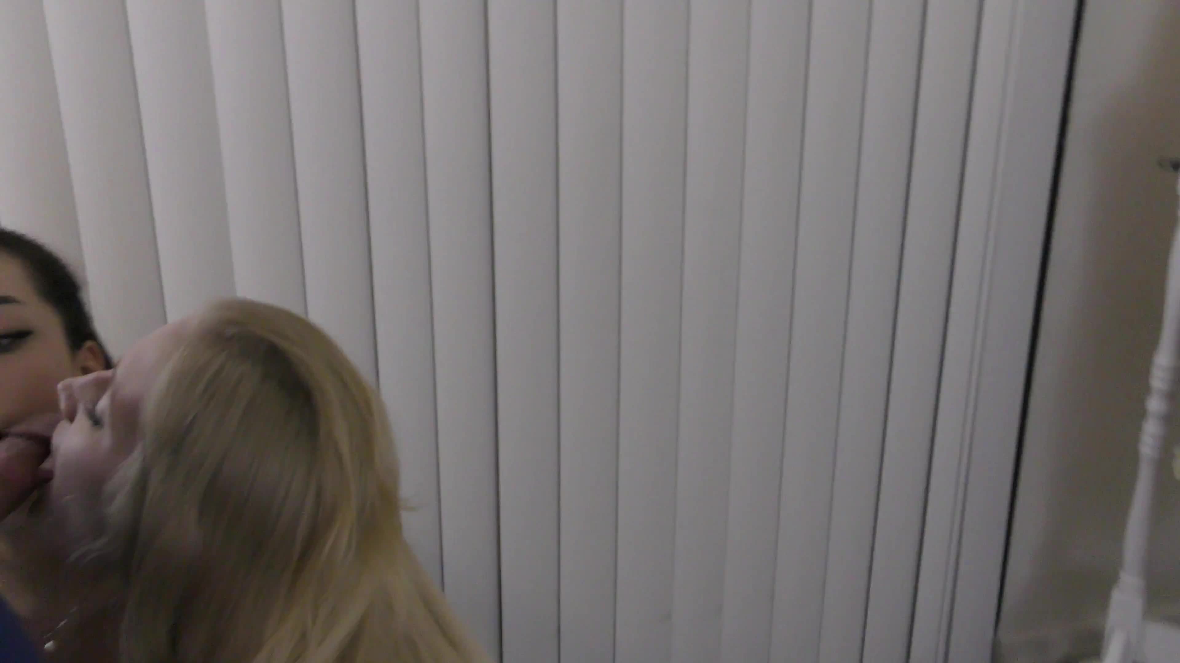 красивые молоденькие брюнетка и блондиночка сначала целуются а потом поочерёдно отсасывают один член на двоих