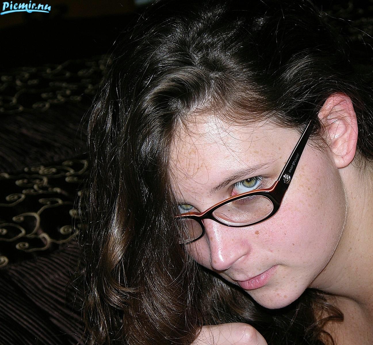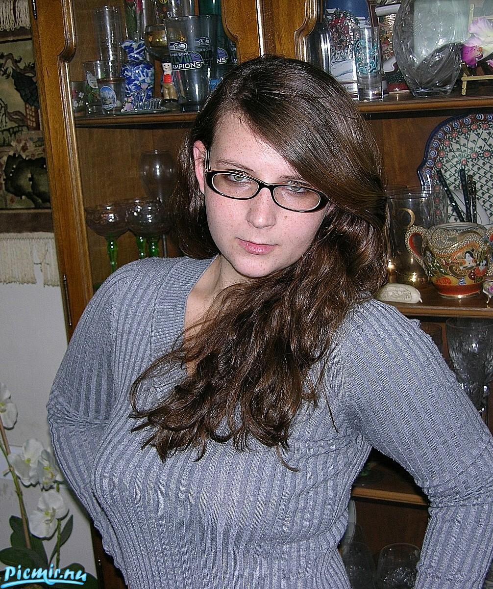 Красивая, грудастая девушка в очках мило разделась на камеру.