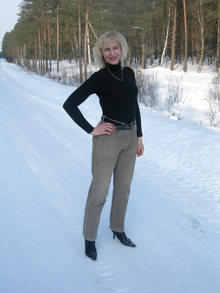 Дамочка в мороз разделась на лесной дороге. Видно холода она не боится.