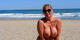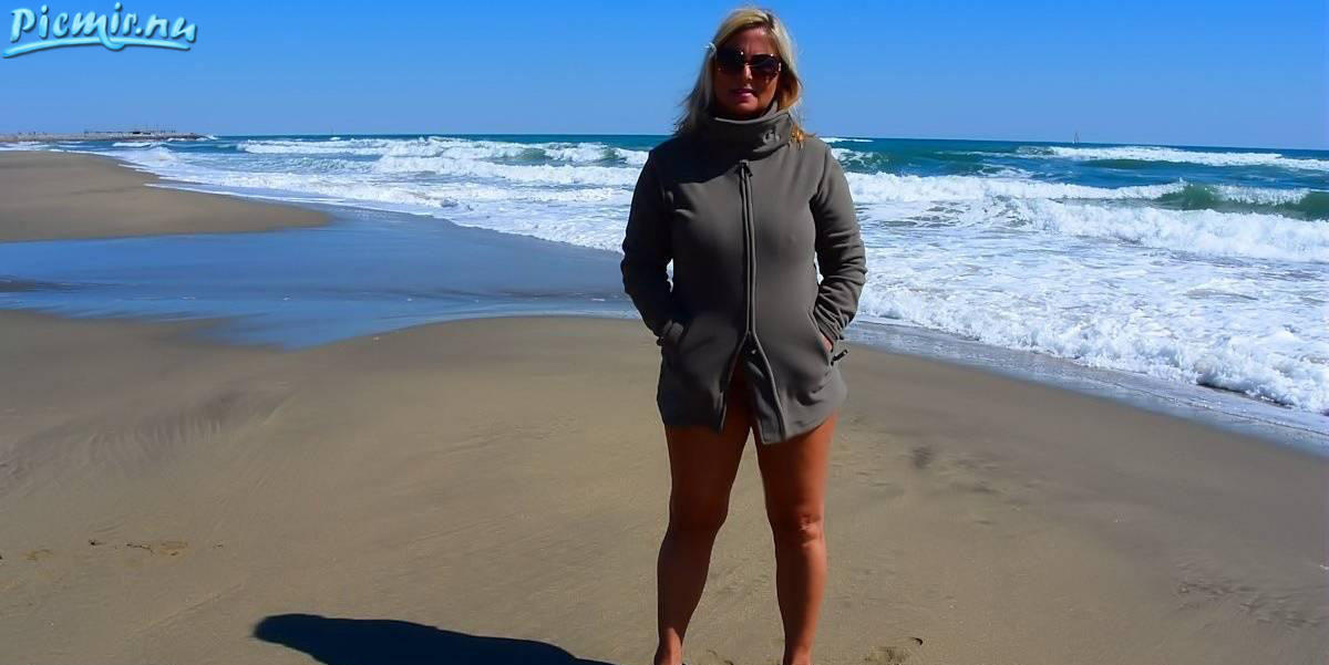 Дама с потрясающей грудью прогуливается по пляжу и позирует)