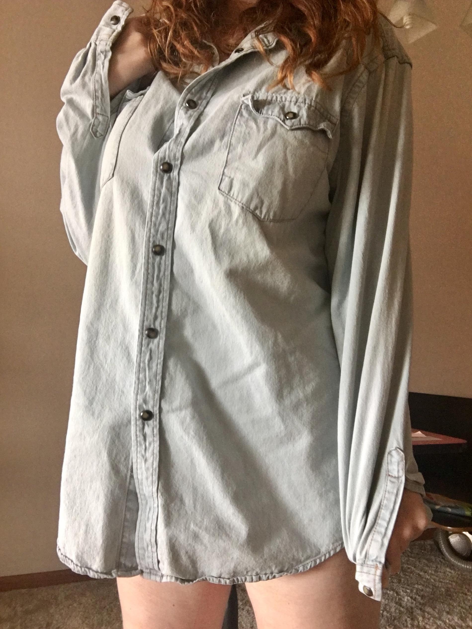 рыжая девчонка красуется в мужской рубашке одетой на голое тело