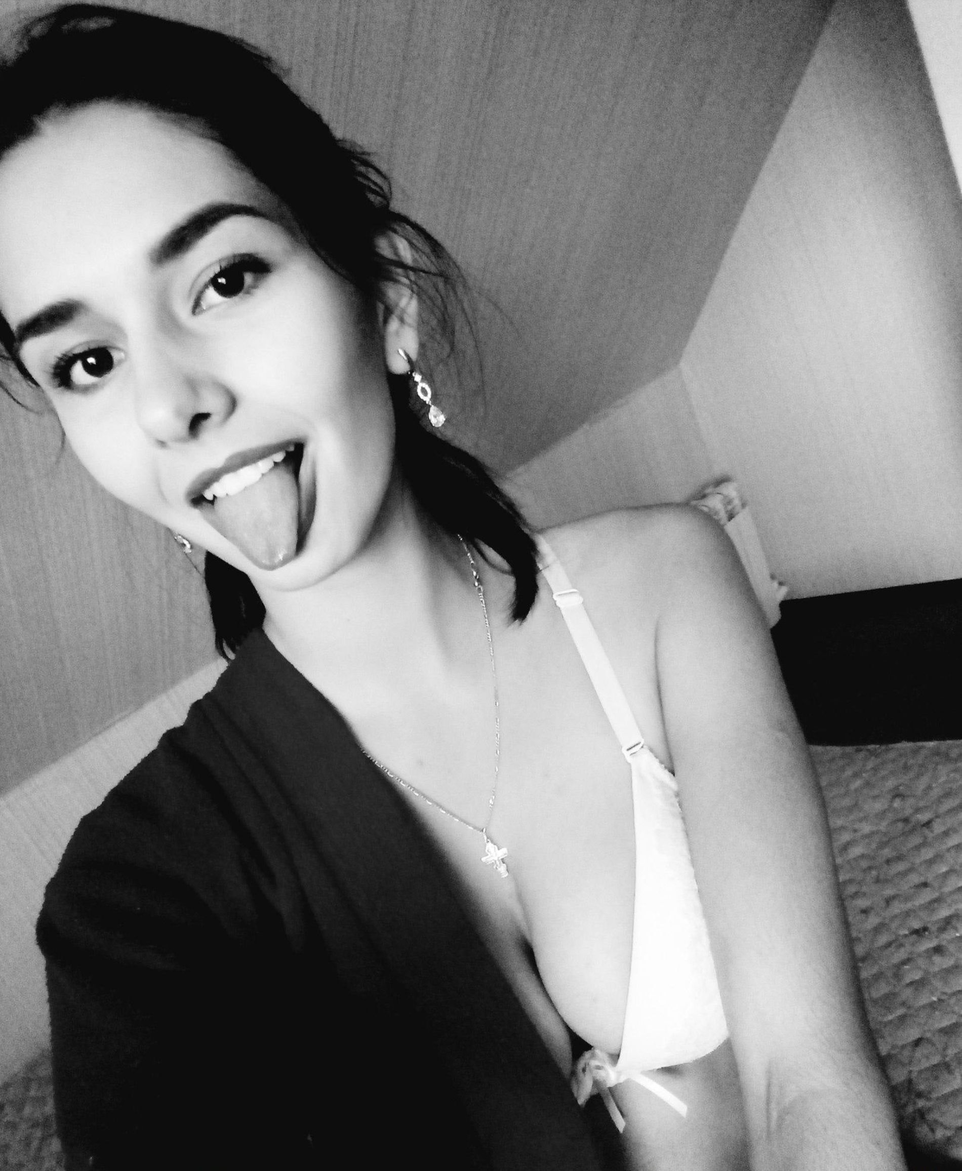 Сия показушница явно гордится своей грудью и своим высунутым шаловливым языком!