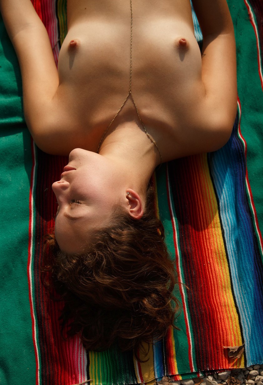 Красотка Хевен с маленькой грудью обнажает свое тело линиями от загара на пляже