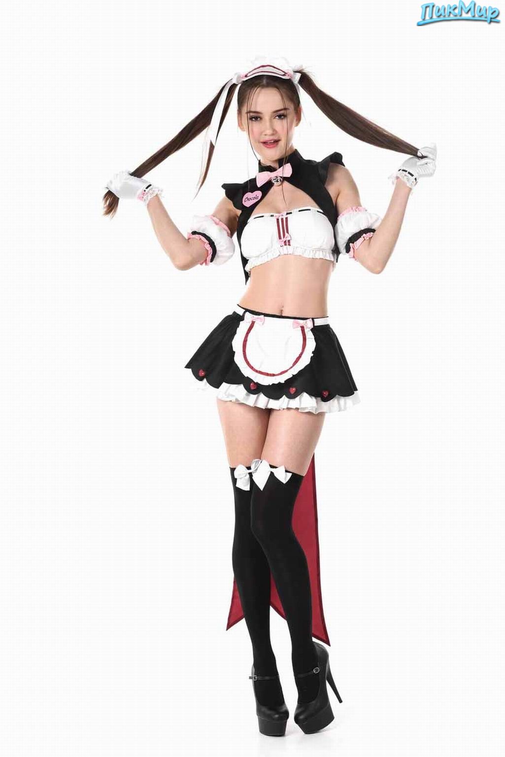 Брюнетка в форме горничной позирует в студии на белом фоне.