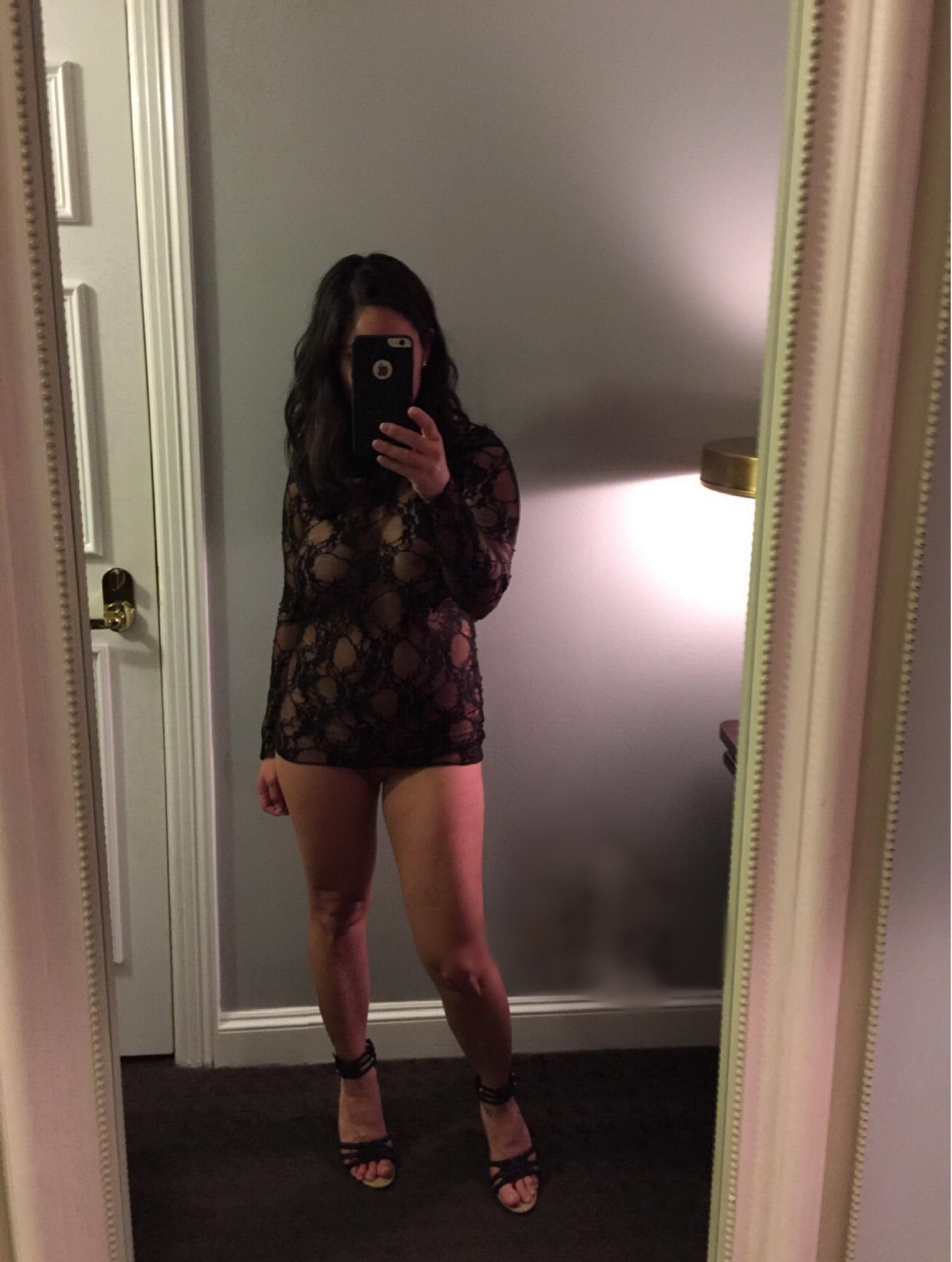 девушка фотографирует себя на телефон демонстрируя полупрозрачную кофточку на своём привлекательном теле