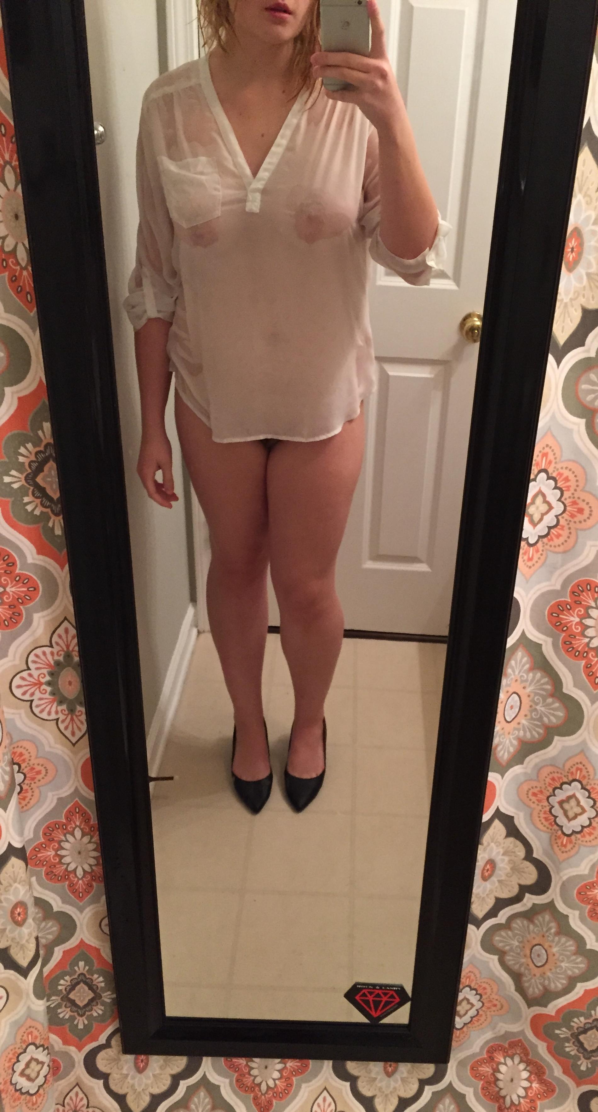 девушка красуется перед зеркалом в мокрой блузке и в фартуке, и снимает себя на телефон
