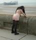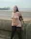 Молодая эммочка позирует на дамбе в одних чулках и ботинках