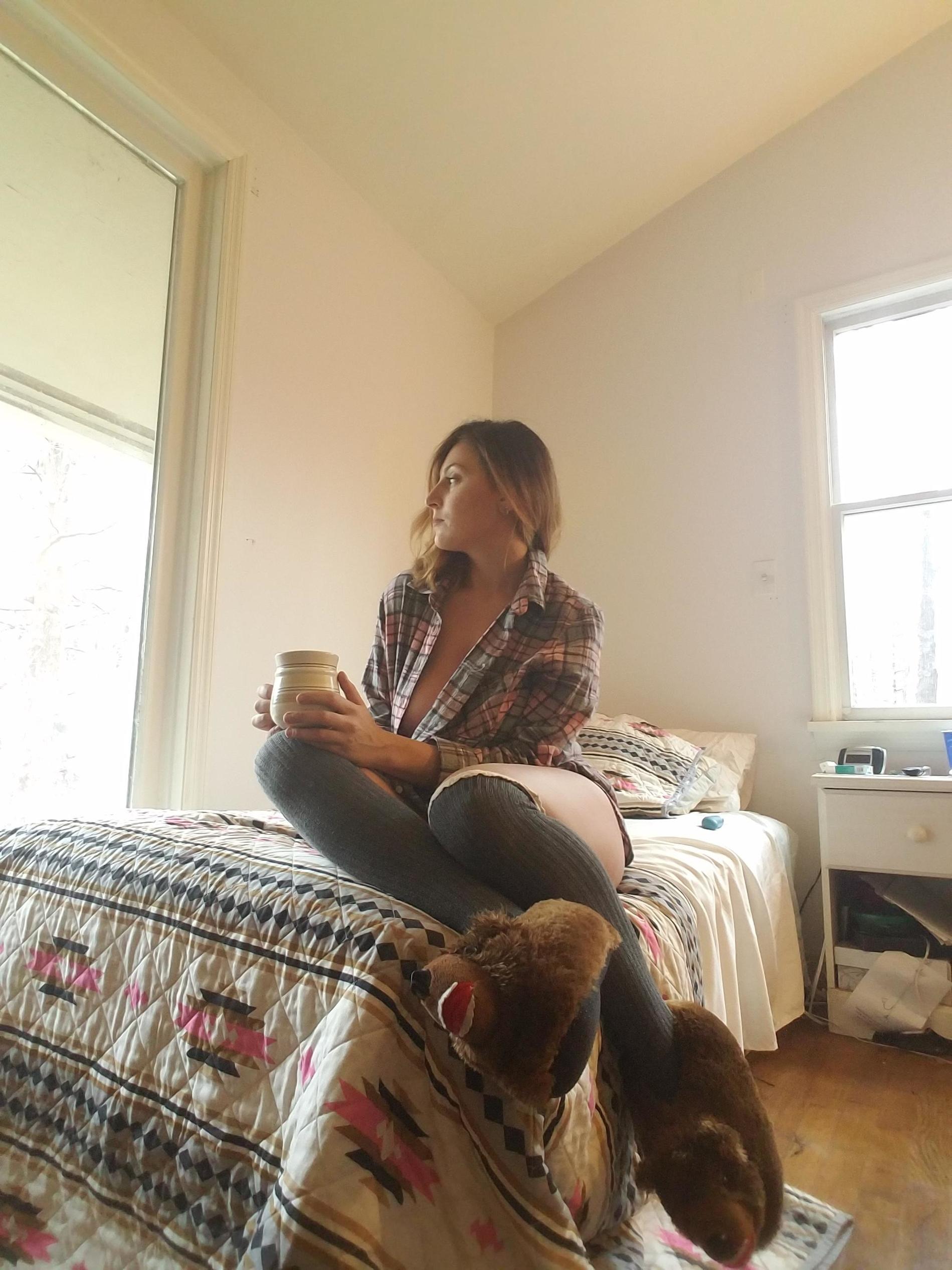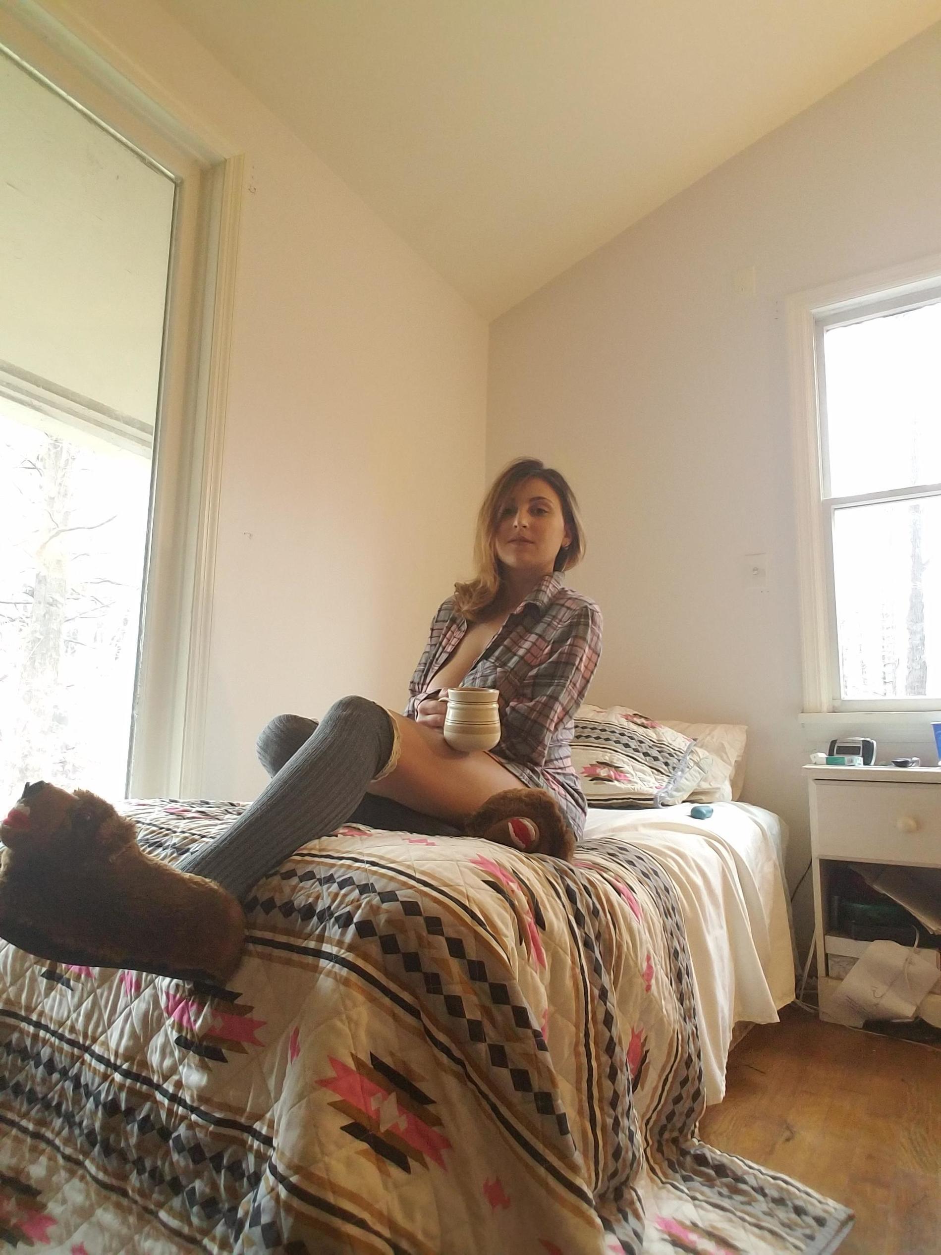 с кружкой чая на кровати