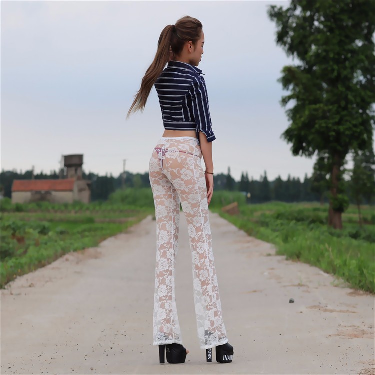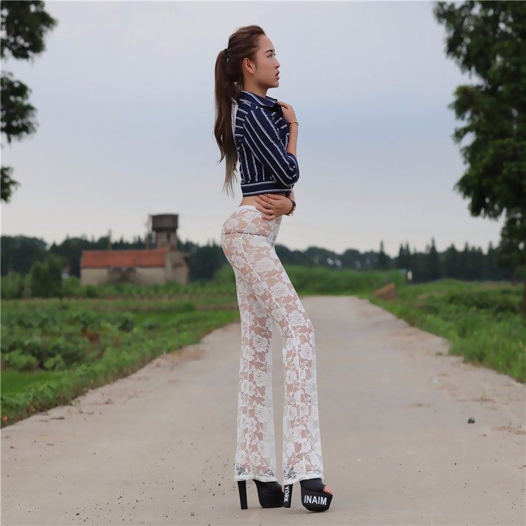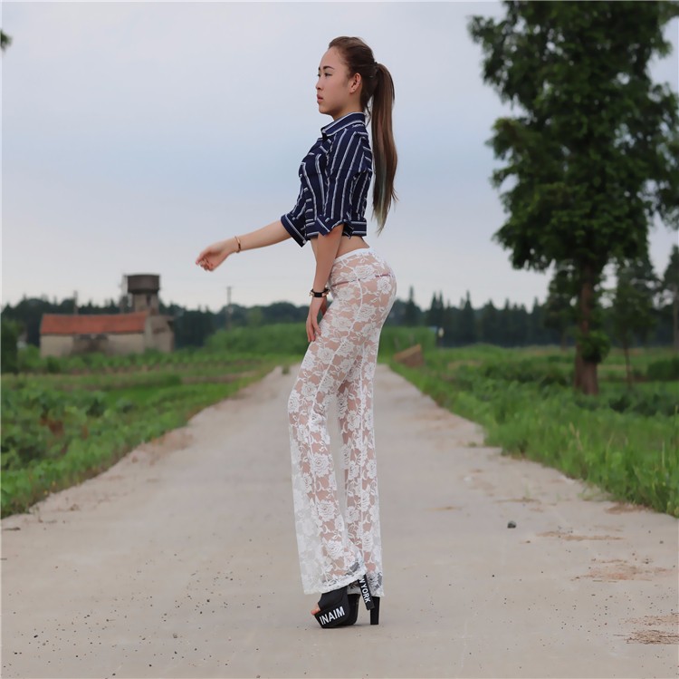 Красивая длинноногая модель с Китая шикарно позирует в прозрачных ажурных штанах.