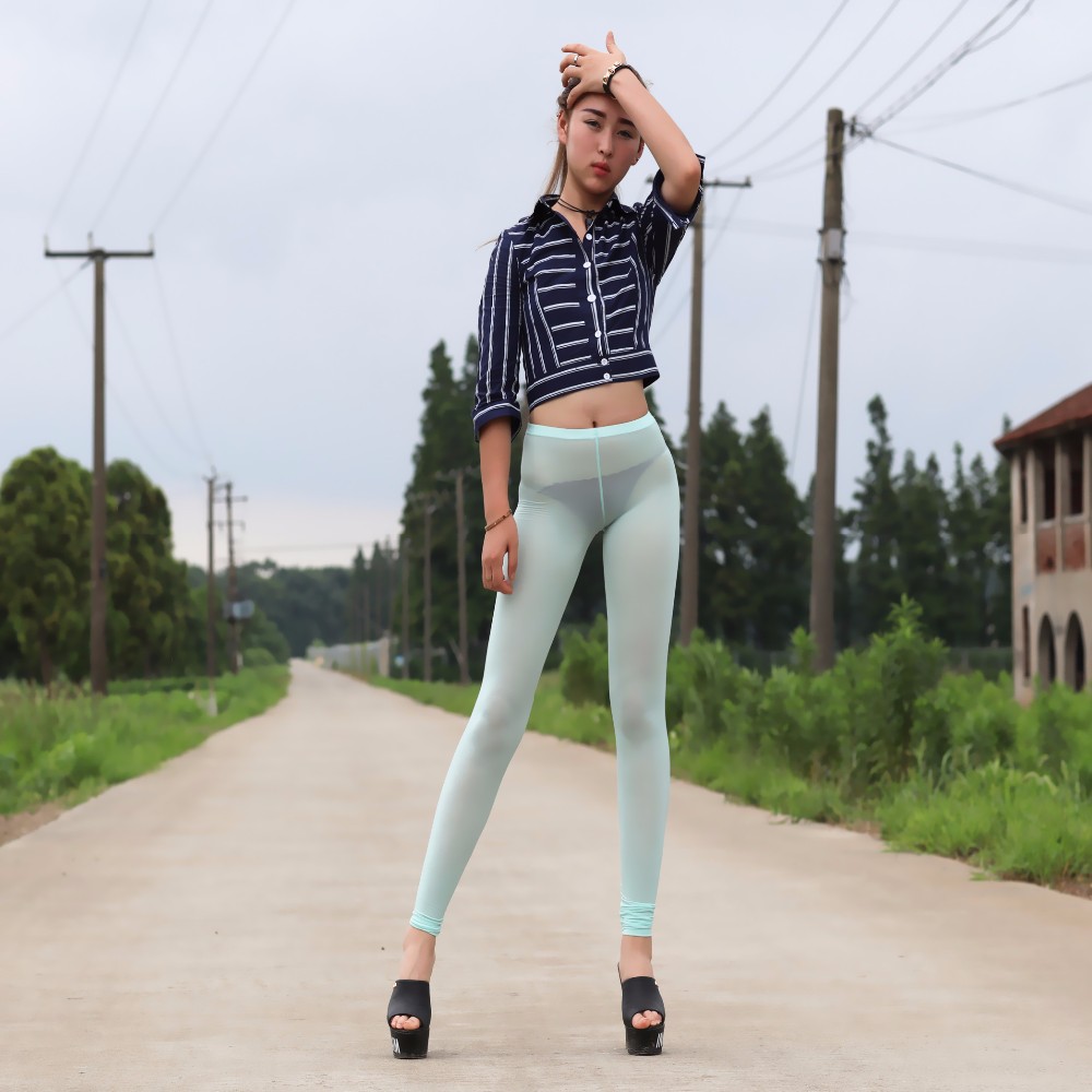 Длинноногая моделька с Китая красиво позирует в прозрачных зеленых легинсах.