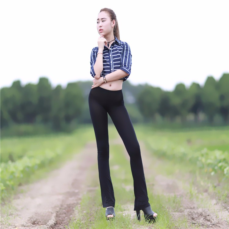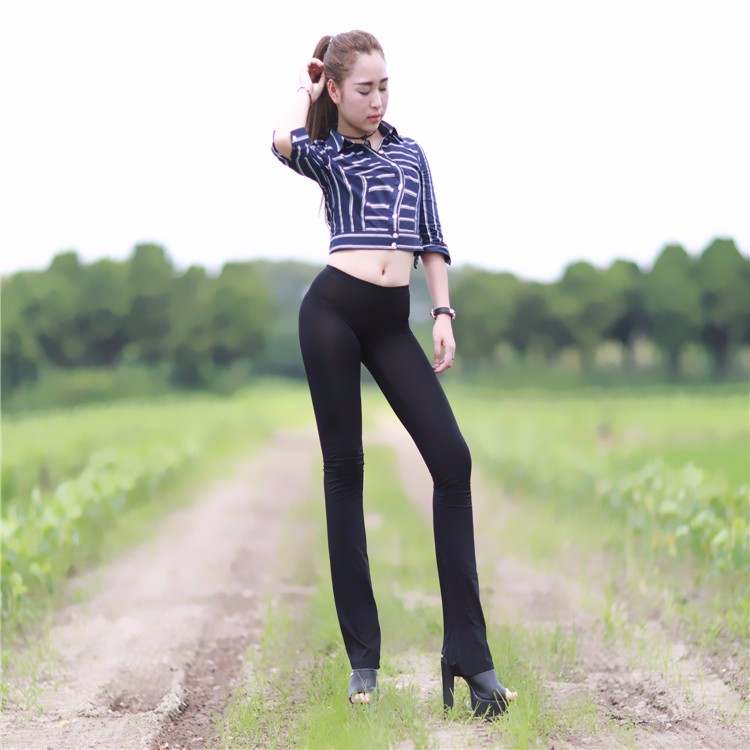 Красивая длинноногая китаяйская модель отлично позрует в черных и белых прозрачных легинсах.
