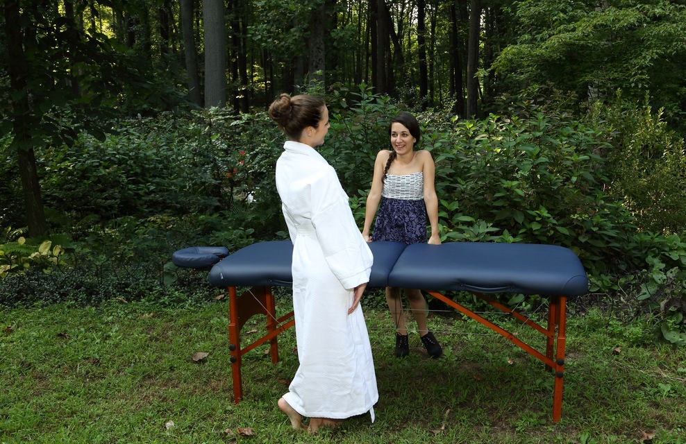 Девушки Алла и Фрейла намазаны маслом перед игрой с киской во дворе