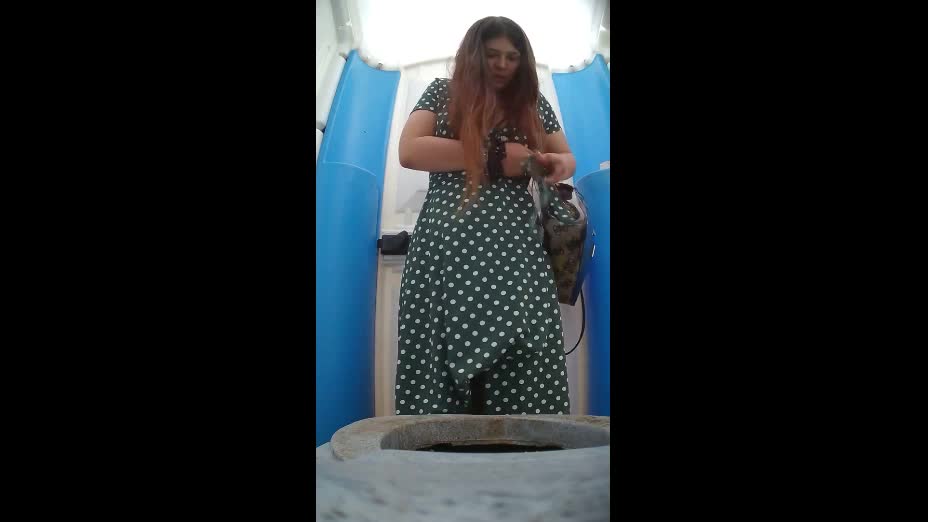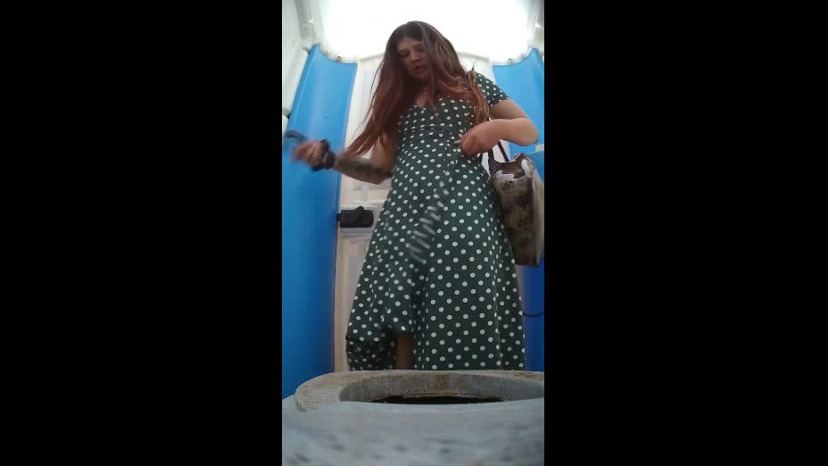Девушка в платье в горошек зашла,в биотуалет где установлена скрытая камера и показала свои прелести.