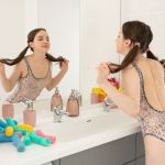 кучерявая милашка зашла в уборную покрасоваться и примерить новое боди
