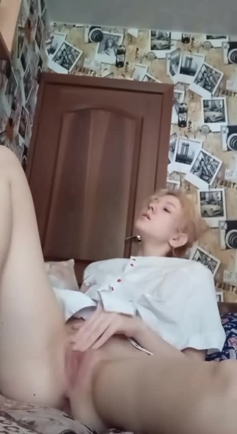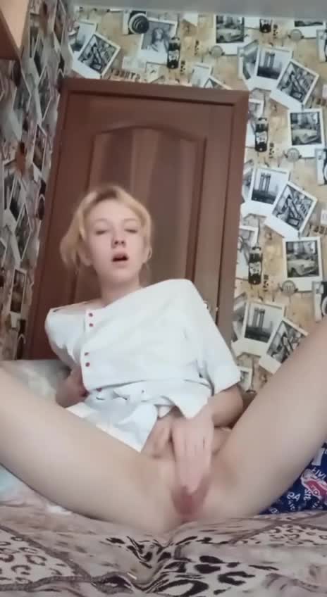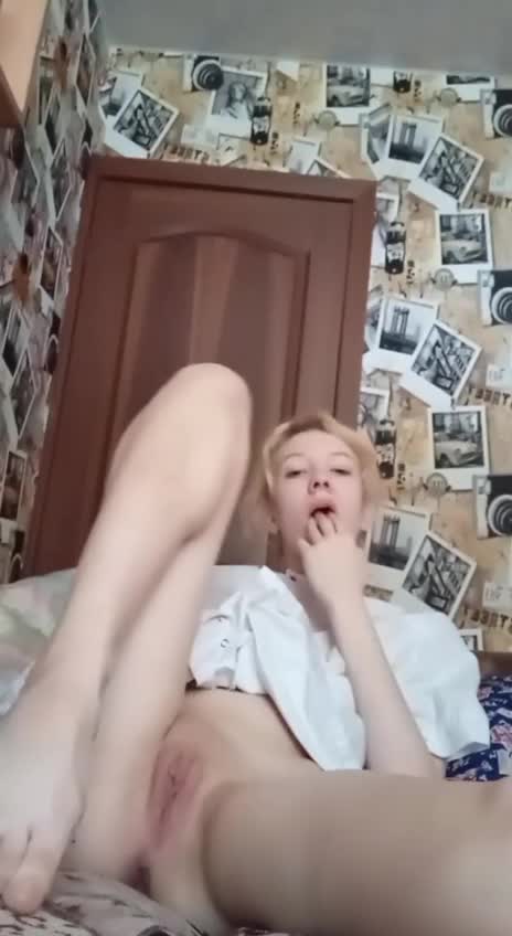 Очень красивая и молоденькая блондиночка показывает свою девичью грудку и маленькую киску