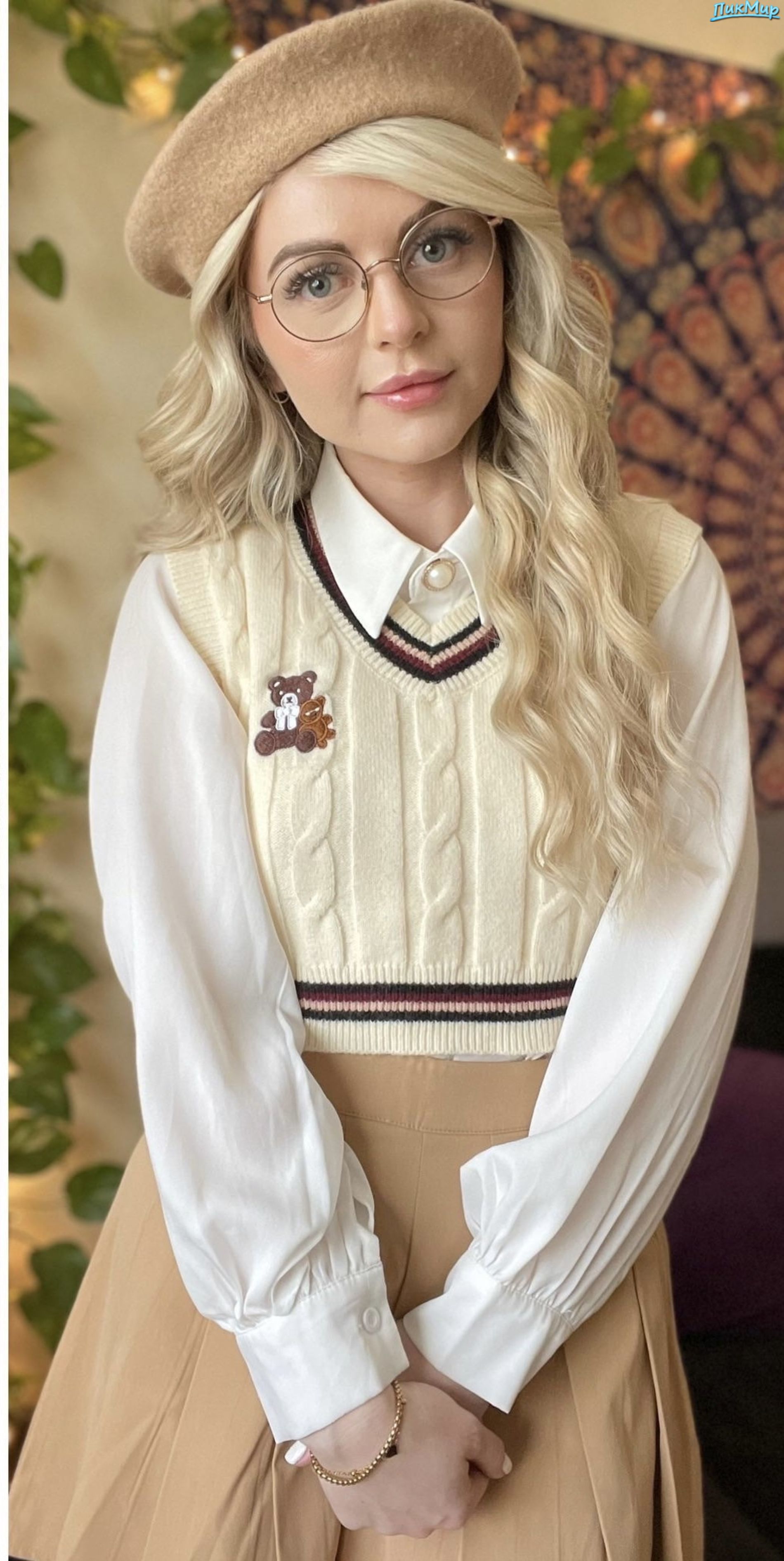 В беретке и одежде, просто пай девочка. Прилежная ученица.