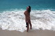 взрослая милашка оголилась перед фотокамерой на пляже на фоне волн демонстрируя свою стройную фигурку с большими сиськами.