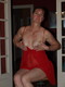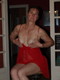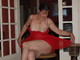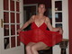 женщина в красной ночьнушки позирует на табуретки