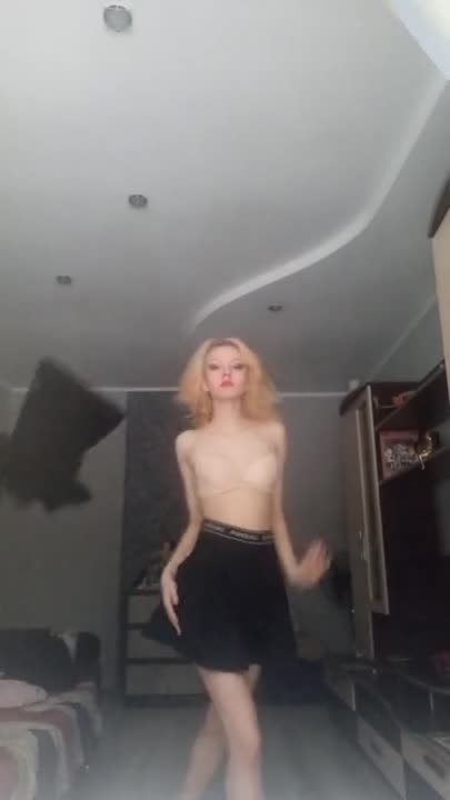 стройная 18 летняя блондиночка медленно снимает с себя всю свою одежду и танцует голой
