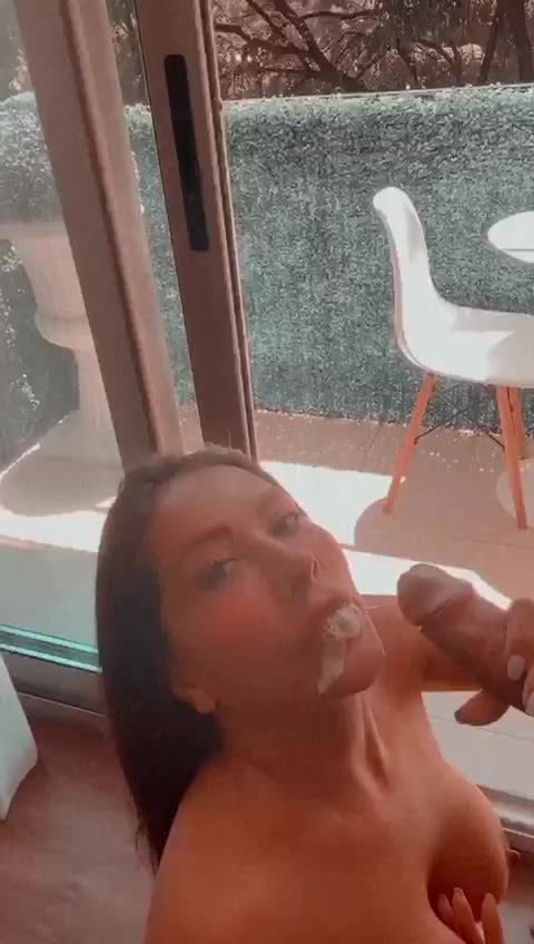 Губастая, пышногрудая девушка отсасывает и принимает в рот сперму
