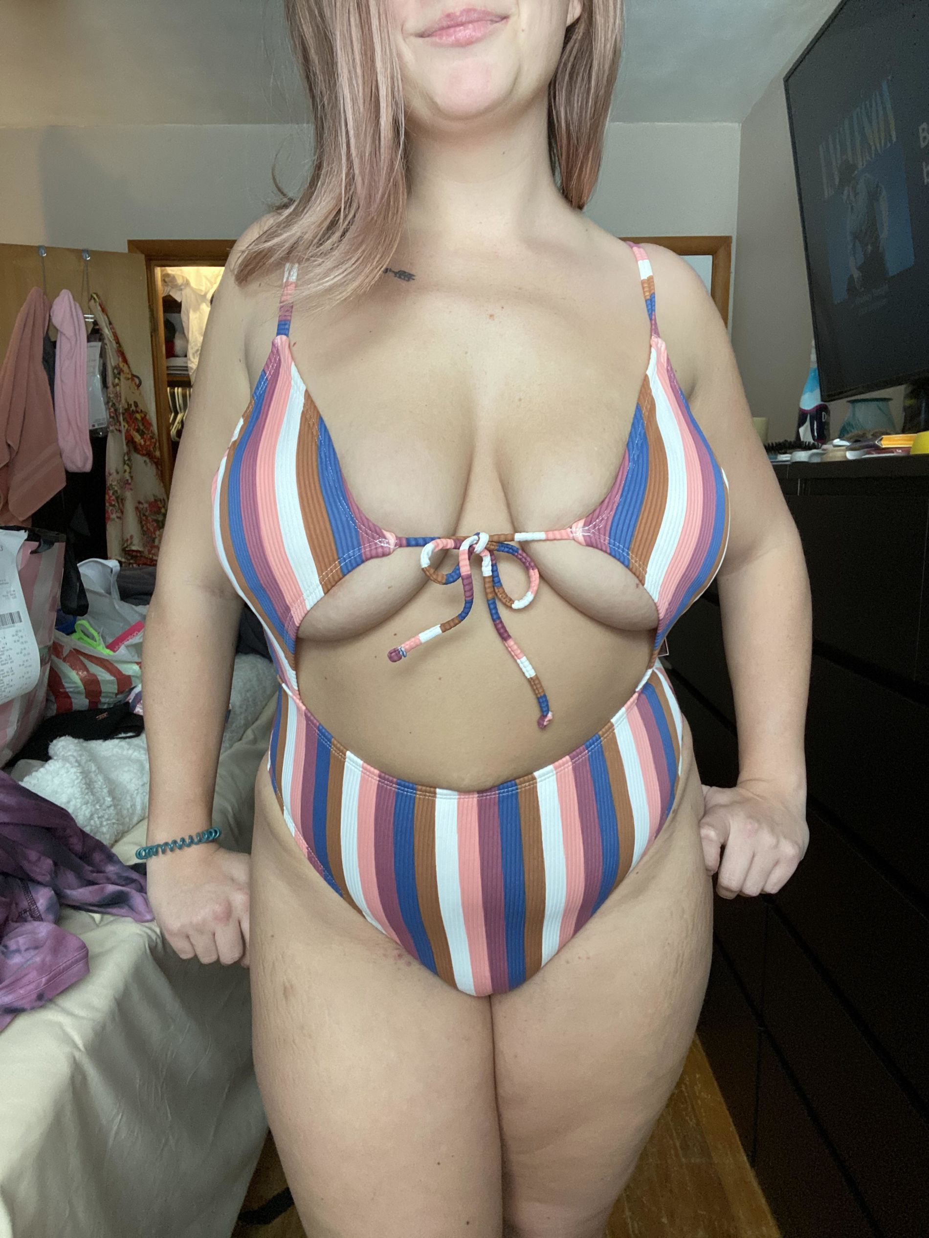 Может для кого-то полосатый купальник и заинтересует. Но без всего её тело более привлекательно.