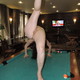 Красивая девушка в простом зелёном платье решила расположиться на столе для игры в бильярд.