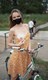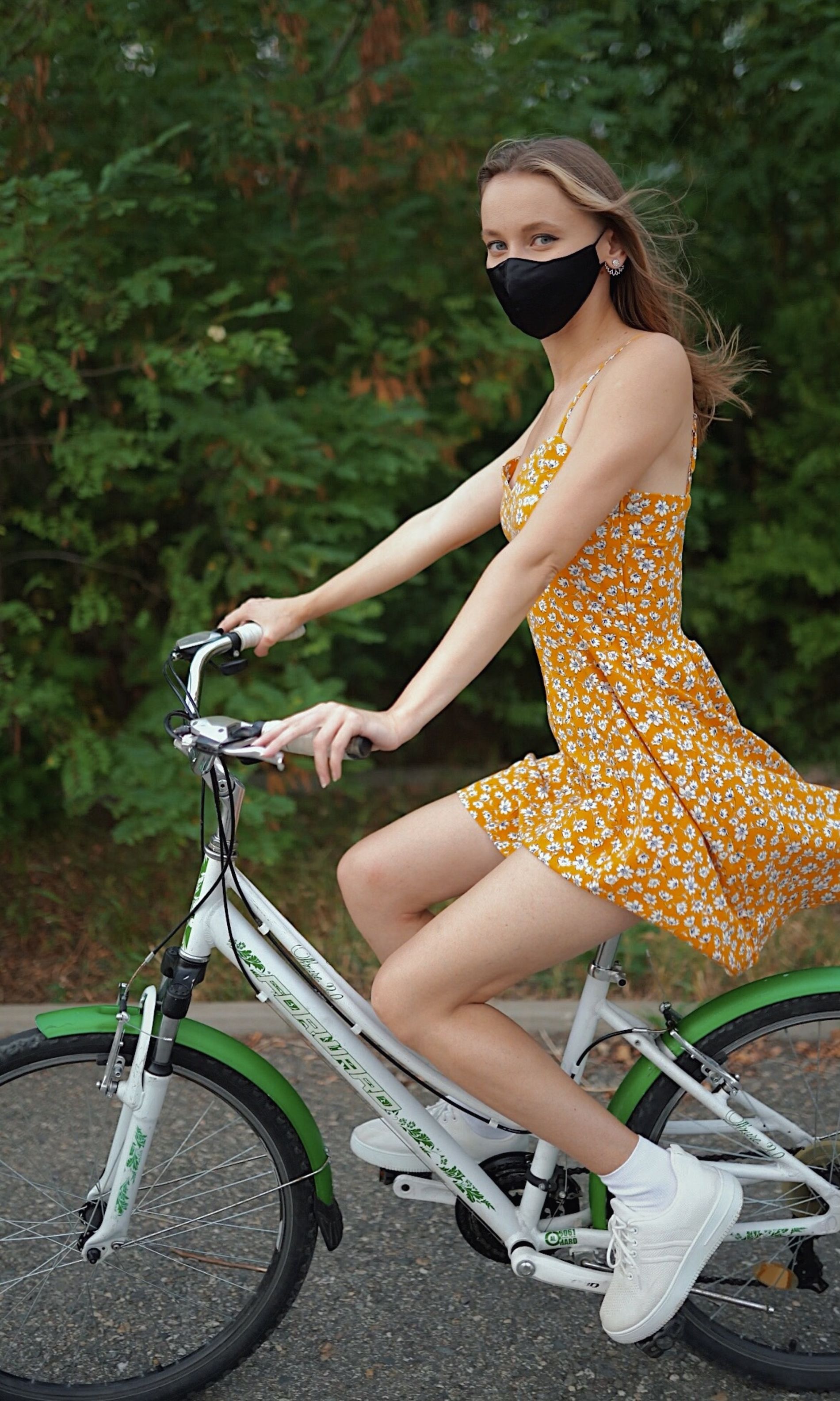 Вторая часть фоток где девушка в маске и платье горчичного цвета катается по городу на велосипеде показывая красивые места.