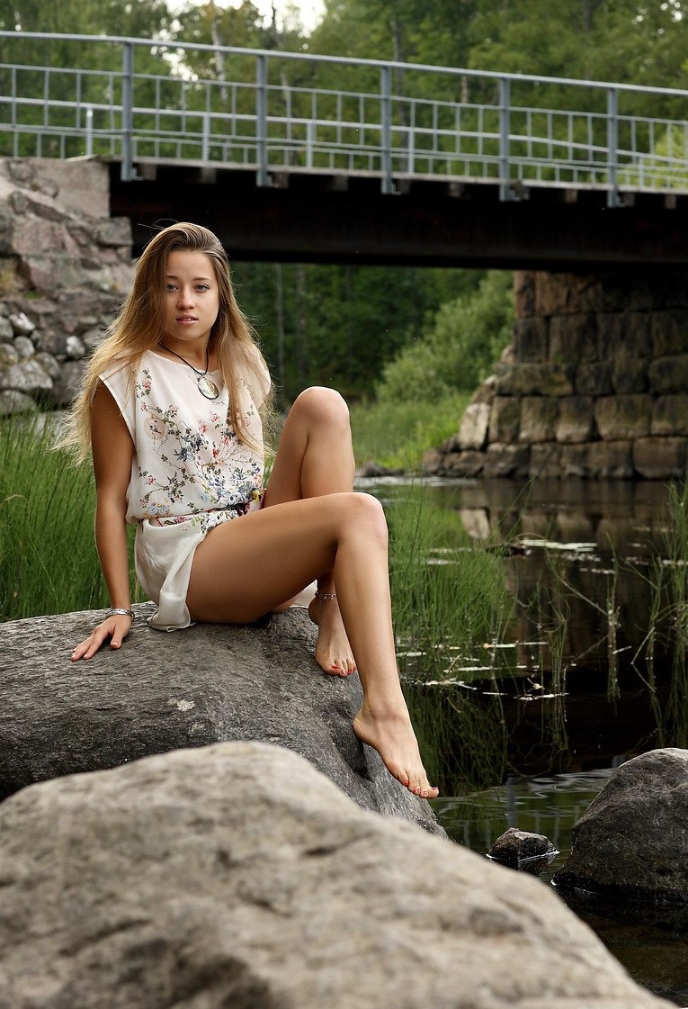 Шикарно малышка Таисия голышом у речки на камнях позирует!