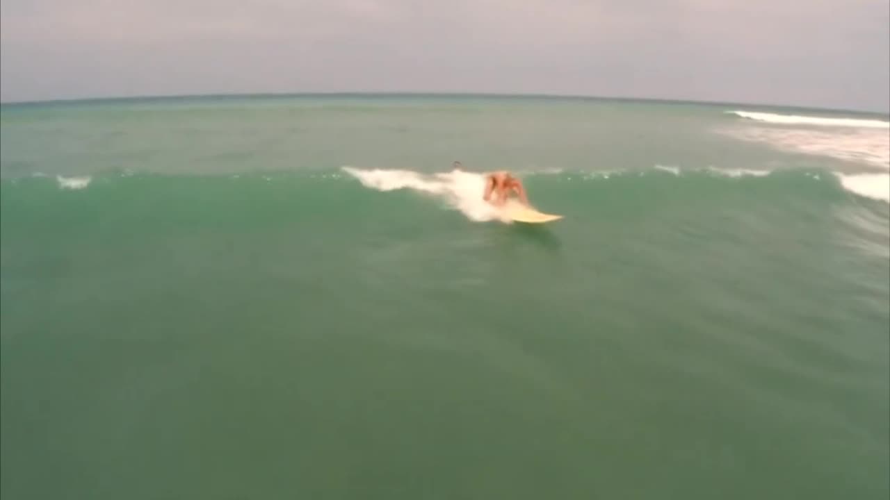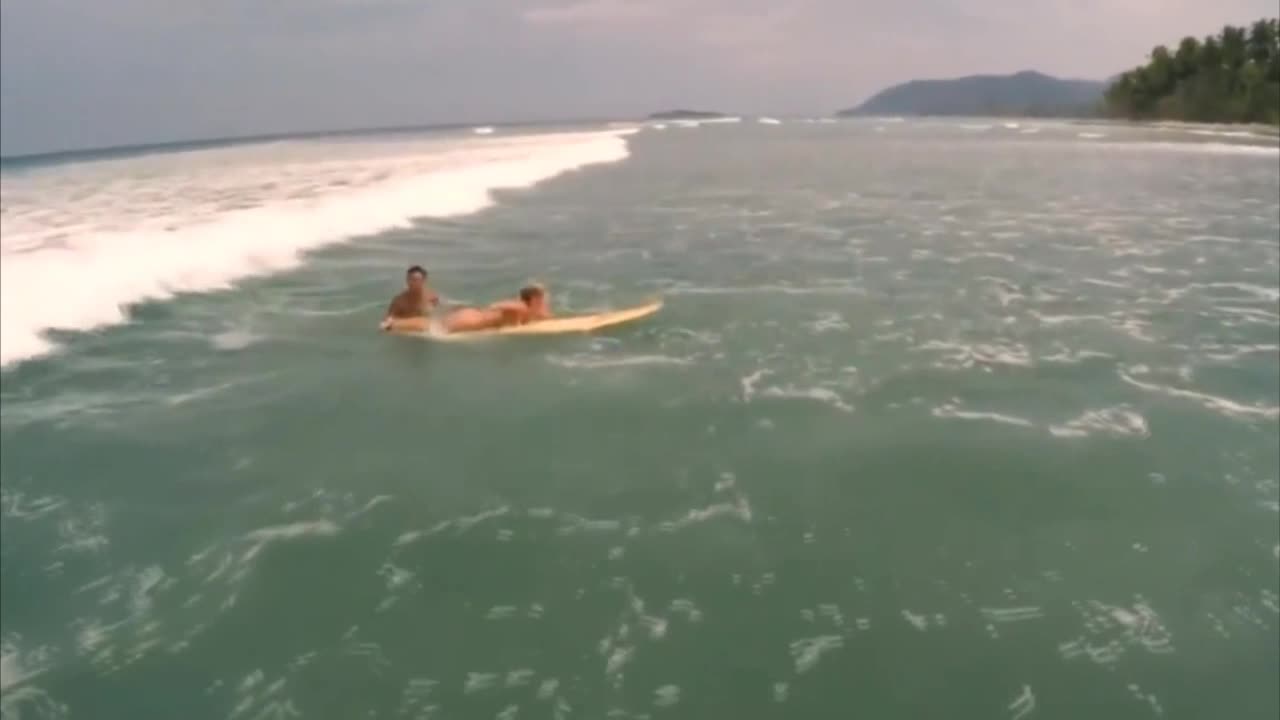 красиво сделанное видео про нудистки, берущей урок серфинга.