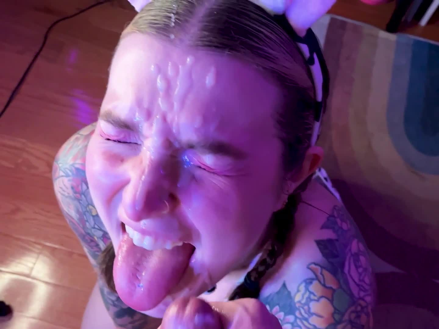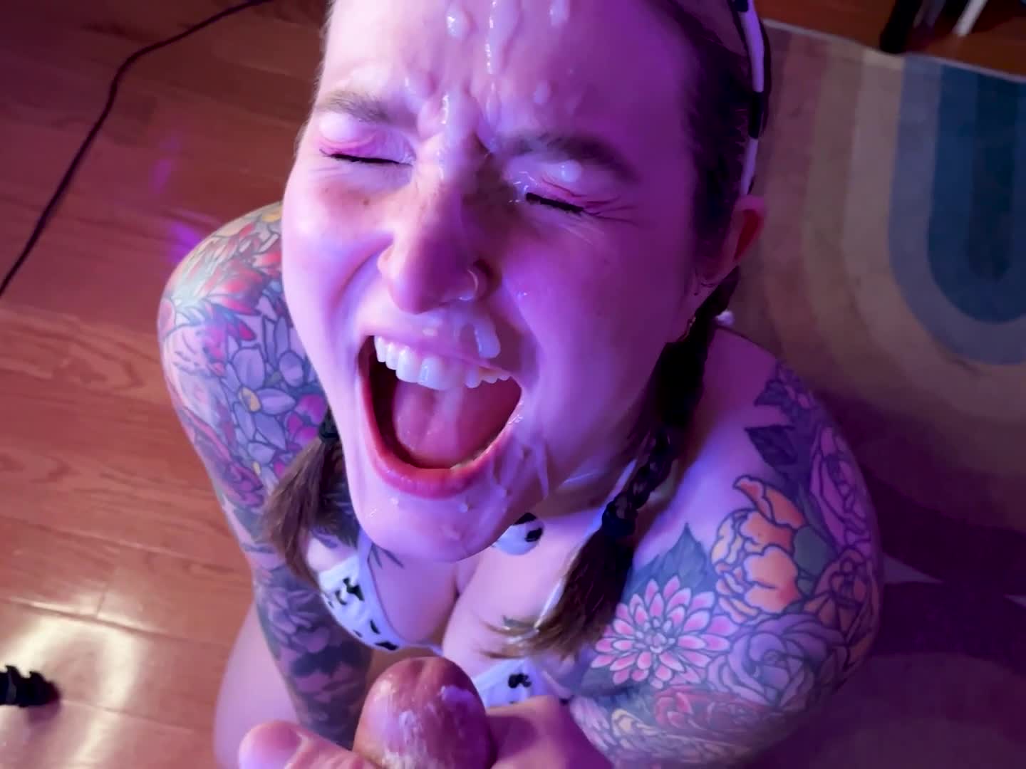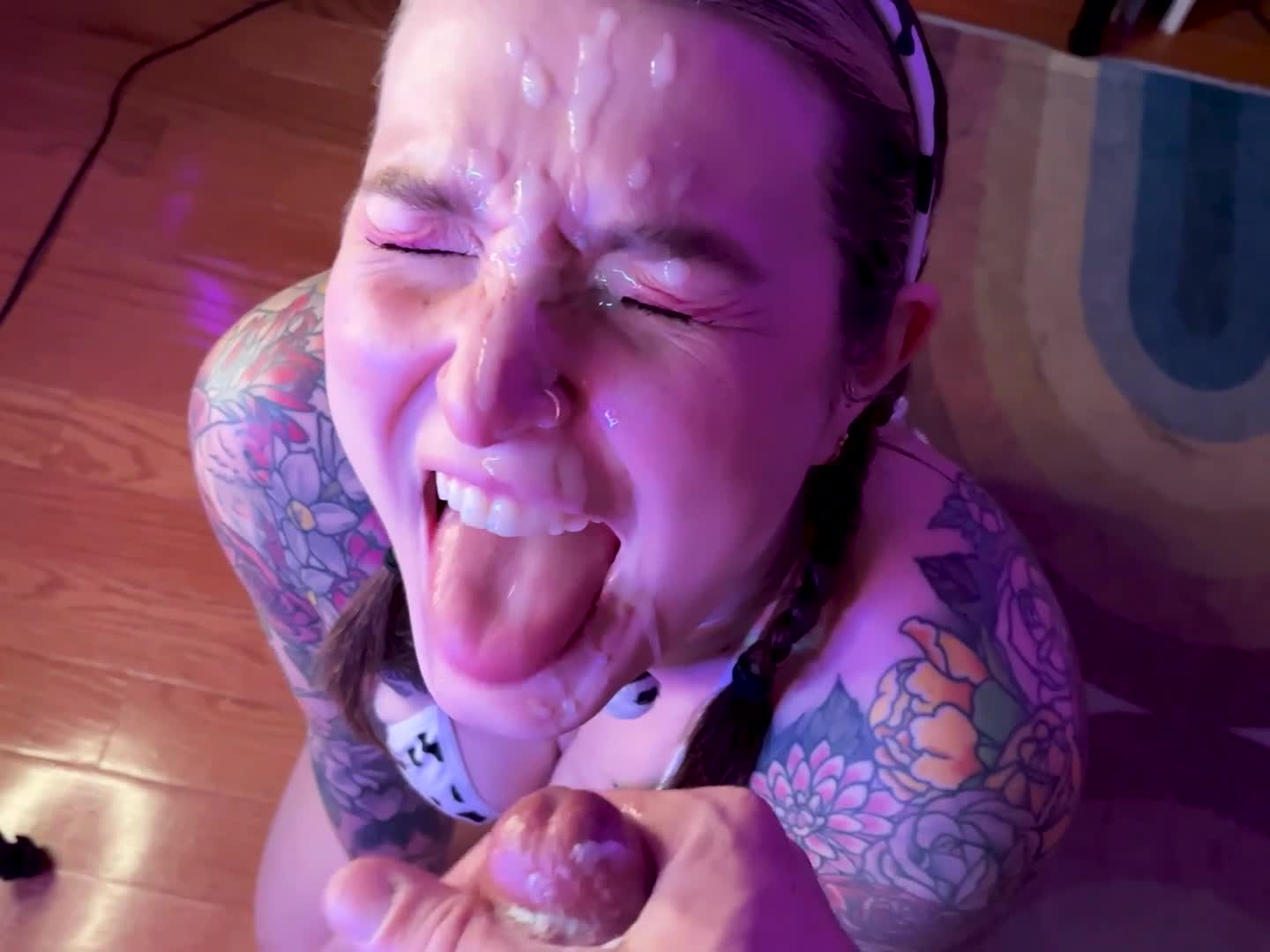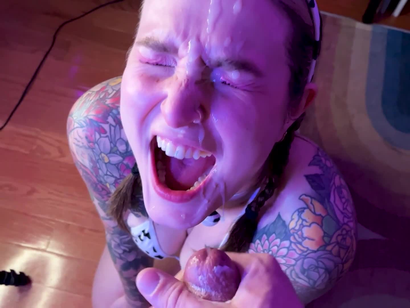 Муж кончил на лицо своей жене к её большому удовольствию и радости.