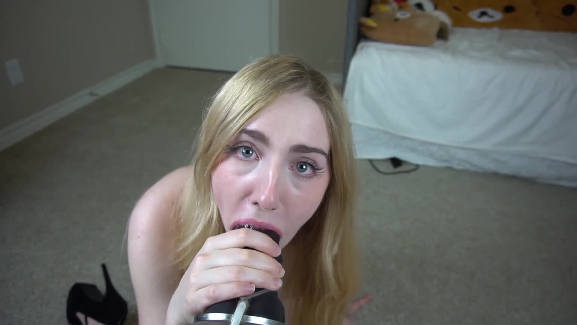 красивая блондинка мечтает отсосать у коня - жадно берёт целиком в рот игрушку - конский дилдо