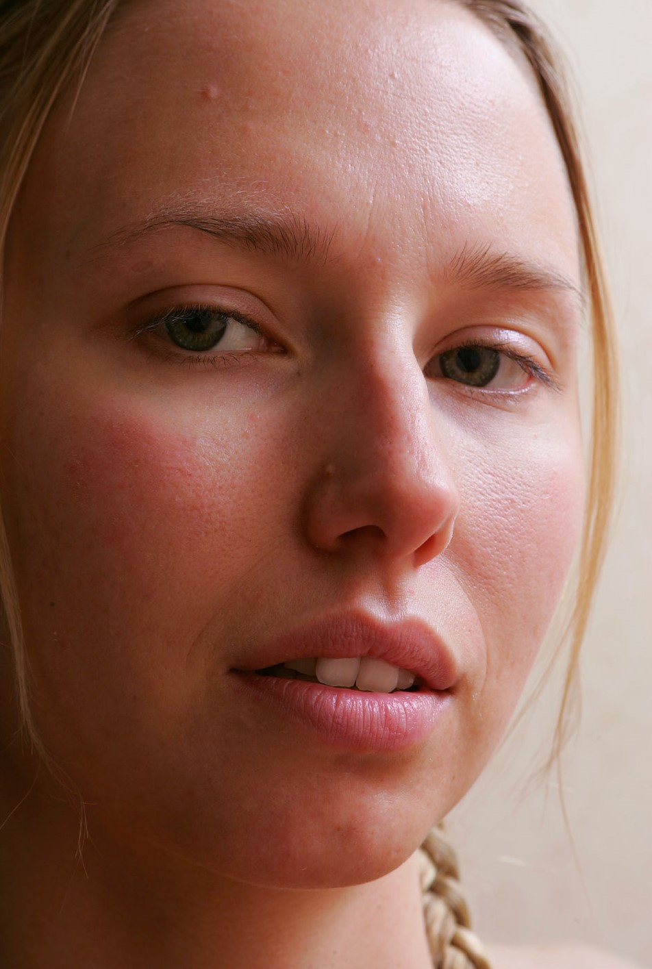 Красотка с косичками смотрит в зеркало