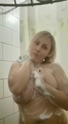 Красивая пышногрудая женщина натирает свою грудь в душе