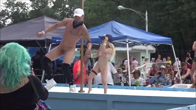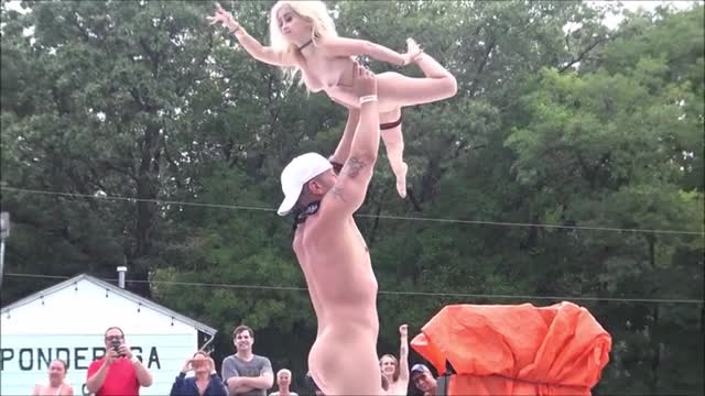 на публике показывает свою миниатюрную партнёршу голую блондинку