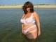 Пухленькая женщина в одиночестве на пляже хвастается своей роскошной грудью