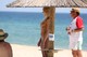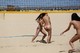 Молодые девушки в монокини загорают на пляже и весело играют в волейбол.