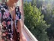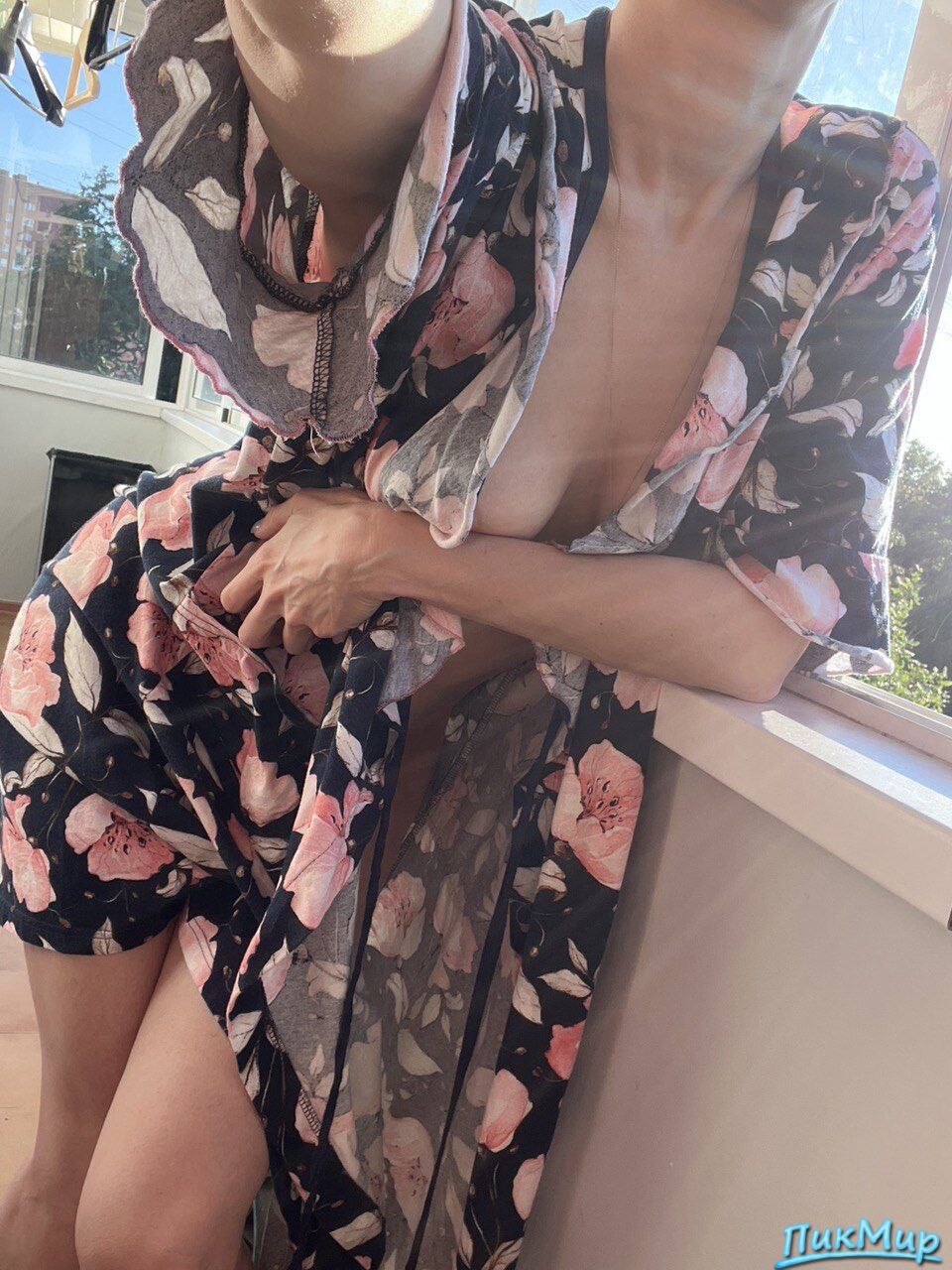 Скромная женщина позирует на балконе. Телка соблазнительно расстегнула и дала возможность насладиться природными сисями